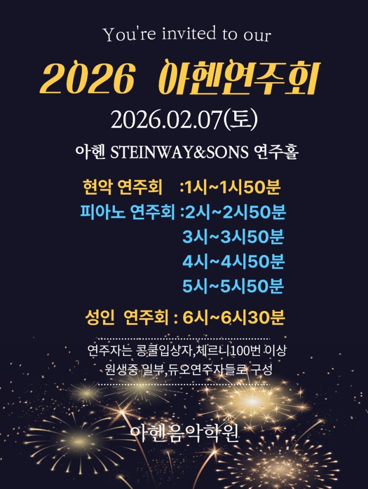 2026새해를 맞이하여 아헨음악학원에서는 피아노,현악,성인부 연주회가 성황리에 열리었습니다 연주 시작전 학부모님들보다 일찍 와서 원에서 연습하고 있는 개구장이면서 귀염둥이인 우리 아가들 드디어 연주 시작! 피아노솔로,듀오,현악 듀요,현악연주♡ 우리 아헨음악학원 연주회 연주자들♡ 너무 기특한 순간순간들 그리고,성인부 연주자어머님도 쵝오 였습니다 아름다운 피아니스트 성인부 어머니♀️ 화면에 다 담지는 못했지만 너무나도 소중하고 추억이 되는 아름다운 순간순간들 이었습니다. 내년2027 아헨연주회는 가족연주회로 추진합니다. 9월에 신청자 받기로 했는데 벌써 두팀 신청했습니다. 아....... <img src="https://blogthumb.pstatic.net/MjAyNjAyMTRfMjgw/MDAxNzcxMDY5MzUzNDYx.lKkt_oUfZ7tMuAlcokXSHNTwsoQqDb5sspA2KczPeucg.knKKh7K4XnERVRFtGqPK5mMEKDsgeztpPksAdbc4uFUg.JPEG/900%A3%DF1768660332243.jpg?type=s3" />