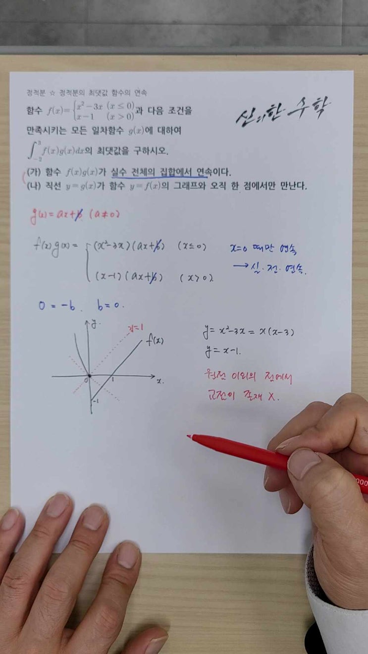 안녕하세요? 시골 시장에서 밥도둑들을 잔뜩 사와서 신이 나는 신의한수학학원입니다. ^^ 오늘 강의는 고등학교 2학년 과정 미적분1 과목에서 정적분의 최댓값을 물어보는데, 함수의 연속도 알아야 하고 교점의 개수도 파악할 수 있어야 하는 문제 풀이 2편입니다. 조건 (나)에서 직선 y=g(x)가 함수 y=f(x)의 그래프와 오직 한 점에서만 만난다고 했으므로 먼저 함수 y=f(x)의 그래프를 좌표평면에 그려 줍니다. x=0을 기준으로 왼쪽에는 이차함수의 일부분을 오른쪽에는 일차함수의 일부분을 그리는 것이므로, 이 정도는 가볍게 그릴 수 있을 겁니다. 자, 이제 직선 y=g(x)를 그려 볼까요? ^^ 정적분 ☆ 정적분의 최....... <img src="https://phinf.pstatic.net/image.nmv/blog_2026_02_16_1072/kRIEu5ZI7R_05.jpg?type=f480x480" />