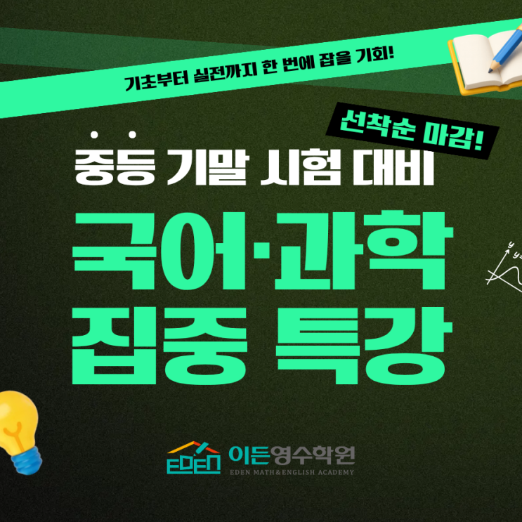 안녕하세요, 이든영수학원입니다 :) 요즘 상담을 하다 보면 학부모님들께서 정말 비슷한 말씀을 많이 주세요. “공부를 아예 안 하는 건 아닌데… 성적이 왜 이럴까요?” 아이들 보면 나름 열심히는 하는데, 막상 시험 보면 결과가 기대만큼 안 나오는 경우가 많죠. 저희가 아이들 수업하면서 느끼는 건 딱 하나입니다. ‘열심히’보다 ‘방향’이 더 중요하다는 것. 특히 중등 기말은 그냥 문제 많이 푸는 걸로는 점수가 잘 안 올라요. 국어는 지문을 제대로 이해해야 하고, 과학은 개념을 문제에 적용할 줄 알아야 하거든요. 그래서 이번에 기말시험 대비 국어·과학 특강을 따로 준비했습니다. 수업 안내 과학 개강 : 5월 7일 (목) 국어 개강 :....... <img src="https://blogthumb.pstatic.net/MjAyNjA0MjNfMjcz/MDAxNzc2OTMyNTE4NDA2.nxAIKZSXgFXrVGjWwVoAfJq0FpxP6rH8lYGE5ZL8-awg.tJnaviOMduf3d-c1sV5NTetgL1FX4BojNDZwkIYlHiQg.PNG/%C1%DF%B5%EE_%B1%E2%B8%BB_%B4%EB%BA%F1_%B1%B9%BE%EE_%B0%FA%C7%D0_%C6%AF%B0%AD_%BD%E6%B3%D7%C0%CF.png?type=s3" />
