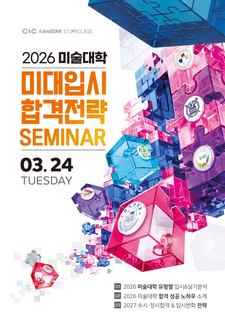 2026 미대입시, 왜 지금부터 전략이 달라야 할까요? 미사 씨앤씨 미술학원 합격전략 세미나 안내 미대입시는 단순히 그림을 오래 그린다고 결과가 나오는 입시가 아니에요. 특히 디자인 계열 미대입시는 대학별 전형 방식, 실기 유형, 학생부와 수능 반영 비율, 수시와 정시의 흐름까지 정확히 이해하고 준비해야 해요. 그래서 해마다 같은 고민이 반복돼요. “어느 대학을 목표로 잡아야 할까요?” “지금 내 실기로 어느 정도까지 가능할까요?” “수시와 정시를 어떻게 나눠 준비해야 할까요?” “입시 변화에 맞춰 지금부터 무엇을 바꿔야 할까요?” 이 질문들에 정확하게 답할 수 있어야 진짜 입시 준비가 시작돼요. 그리고 이런 질문에 경....... <img src="https://blogthumb.pstatic.net/MjAyNjAzMTlfODUg/MDAxNzczODk4Nzk0OTc4.__xGXw9KbKJh_gHZC2csHakQI38glrTVZLVbrWMHu5Qg.3FoSdRYp0K2zBhclaUqpD-rApF8dmypRiigegako5YIg.JPEG/2026_%B9%CC%B4%EB%C0%D4%BD%C3%C7%D5%B0%DD%C0%FC%B7%AB%BC%BC%B9%CC%B3%AA_%C6%F7%BD%BA%C5%CD_%C3%D6%C1%BE.jpg?type=s3" />