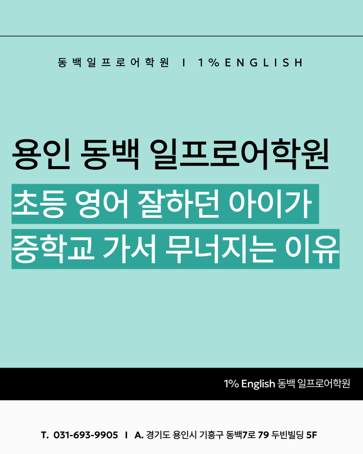 안녕하세요. 동백동 초등 중등 고등 영어학원 동백 일프로어학원 입니다. “초등학교 때 영어 잘하던 아이가 왜 중학교 가면 갑자기 흔들릴까요?” 중학교에 올라가면서 갑자기 영어를 어려워하거나 성적이 흔들리는 경우가 생각보다 많습니다. 초등 영어와 중학교 영어는 요구하는 ‘영어 능력의 구조’ 자체가 다르기 때문입니다. 1% ENGLISH 용인 동백 일프로어학원 초등 영어 잘하던 아이가 중학교 가서 무너지는 이유 학습량이 늘어서 그런가, 중학교 시험이 어려워서 그런가 생각하시지만 사실 더 근본적인 이유는 따로 있습니다. 초등 영어는 읽기 듣기 말하기 중심의 언어 경험이 많습니다. 하지만 중학교 영어는 시험을 통해 정확한 이....... <img src="https://blogthumb.pstatic.net/MjAyNjAzMTFfMTU0/MDAxNzczMTU2NDIxMzA3.X2lwwrcDcLRh0bBcm5iOaRJ6FKNFWze-VQYrgOL8JsUg.iOOkkPRzq_Bt2GkHeXwJPY8n7XhlwSGB0aBzeBbM0aIg.PNG/%C1%A6%B8%F1%C0%BB_%C0%D4%B7%C2%C7%D8%C1%D6%BC%BC%BF%E4._%2826%29.png?type=s3" />
