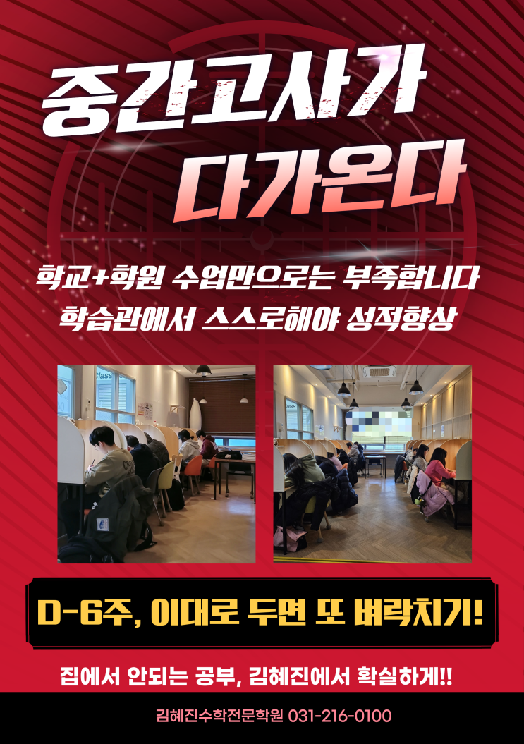 안녕하세요. 흥덕수학 김혜진수학학원입니다. 3월이 되면서 고등학생들에게 가장 중요한 일정 중 하나인 중간고사 준비가 시작됩니다. 흥덕 김혜진수학학원 고등부에서는 3월 16일부터 중간고사 대비 학습을 시작합니다. 고등학생 시험 준비는 시험기간에 갑자기 시작해서 되는 공부가 아닙니다. 특히 수학 과목은 개념 이해 → 문제 풀이 → 반복 학습 과정이 필요하기 때문에 시험 전 충분한 준비 시간이 중요합니다. 김혜진수학 고등부에서는 중간고사 기간 동안 다음과 같은 방식으로 학습이 진행됩니다. • 시험 범위 개념 정리 • 학교별 시험 유형 문제 풀이 • 반복 문제 풀이 및 오답 정리 • 학습관 자기주도 학습 관리 학생들이 단순....... <img src="https://blogthumb.pstatic.net/MjAyNjAzMTJfNDYg/MDAxNzczMzAwNTAwMDEw.tyBxfBcQG36h6T-A7xhnA5TYDs5jspBTTiytK8RtlHMg.XFiYGTz9mS6MhpaEd5XTTRV6p9OIDN2X3OlqYltYyCog.PNG/%C1%DF%B0%A3%B0%ED%BB%E7%B0%A1%B4%D9%B0%A1%BF%C2%B4%D9.png?type=s3" />