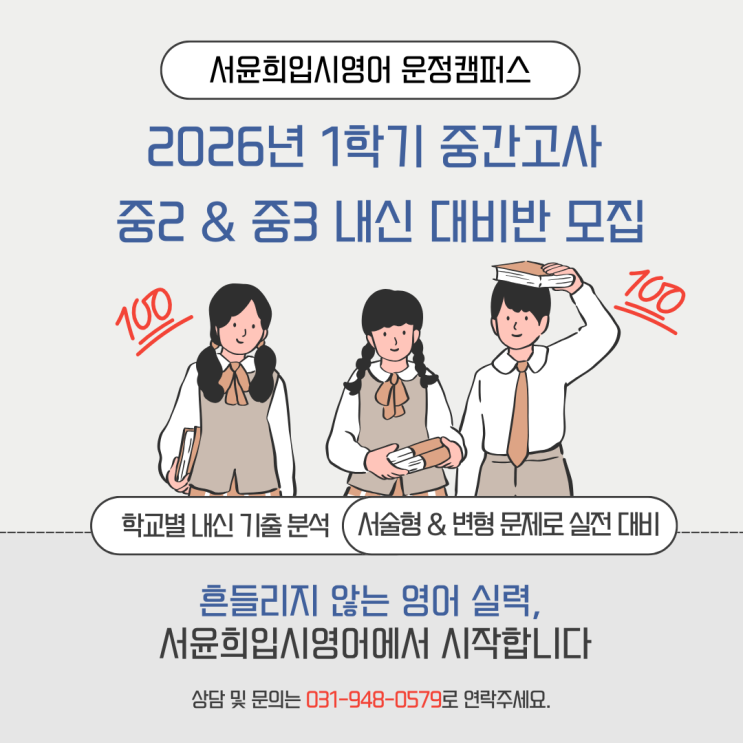 운정 학부모님들 안녕하세요. 서윤희입시영어 운정캠퍼스입니다. 2026년 1학기 중간고사 대비 중2·중3 내신 대비반을 모집합니다. 이번 내신 대비 수업은 3월 30일(월) 시작 예정이며 내신 대비가 시작된 이후에는 신입생을 받지 않습니다. 시험 대비가 시작되면 학교별 범위와 문제 유형에 맞춰 수업이 진행되기 때문에 중간 합류는 어려운 점 양해 부탁드립니다. ⭐ 이런 학생에게 추천합니다 ⭐ ✔ 시험 기간마다 단어만 외우다가 끝나는 학생 ✔ 서술형이나 변형 문제에서 점수가 떨어지는 학생 ✔ 학교 시험 유형을 제대로 대비하고 싶은 학생 ✔ 단순 암기가 아니라 이해 중심으로 영어를 배우고 싶은 학생 ⭐ 내신 대비 방....... <img src="https://blogthumb.pstatic.net/MjAyNjAzMTFfMTI0/MDAxNzczMjMzNjgzNzM0.sM2trxSWx8aCpycyJB7X49pe4_VuhyBYWOi9f_5-0U0g.NhPyDCz4LClE1ArmZZLx0BcI9qgqJW__2EeVjBfhNSAg.PNG/%BA%EA%B6%F3%BF%EE_%BA%ED%B7%E7_%B1%CD%BF%A9%BF%EE_%C0%CF%B7%AF%BD%BA%C6%AE%B7%B9%C0%CC%BC%C7_%BF%A9%B8%A7%B9%E6%C7%D0_%C6%AF%B0%AD_%B0%B3%BC%B3_%C0%CE%BD%BA%C5%B8%B1%D7%B7%A5_%B0%D4%BD%C3%B9%B0_%281%29.png?type=s3" />