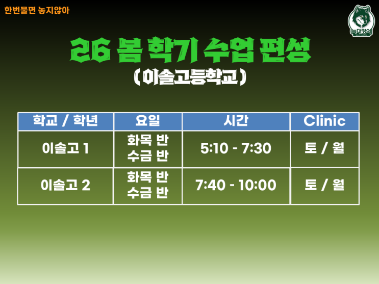 안녕하세요, 한번물면 놓지않는 늑대영어입니다. 3월이 주는 메세지 새학교, 새학년, 새학기에 대한 기대 약간의 긴장감 그리고 출발 늑대영어가 새롭게 출발하는 학생들의 미래를 책임지겠습니다. 그리고 26년도 고등부 내신대비 시간표를 확정하여 공지합니다. 1. 이솔고등학교 내신대비반 작년 늑대영어에서 큰 성과를 거뒀던 이솔고등학교 내신대비반 시간표 입니다. 25년 이솔고1 재원생 1등급 인원 15명(이솔고 전체 1등급 인원 중 50% 차지) 명실상부 이솔고등학교 영어 내신은 늑대영어가 주도하고 있습니다. 담당 : 최지헌T 2. 정현고등학교 내시대비반 정현고등학교 내신대비반 시간표입니다. 올해 늑대영어에서 가장 성과를 기대하는....... <img src="https://blogthumb.pstatic.net/MjAyNjAxMjlfODIg/MDAxNzY5NjgyODczMDg3.LEA0X8eMoD9lYHHXAPb7uwBrxp9JWb8jWb0plLPK2pwg.q-apn2j1euRTNxiGuopt3WI8m-cfLqPePjn5Ci83tIgg.PNG/%BD%BD%B6%F3%C0%CC%B5%E56.PNG?type=s3" />
