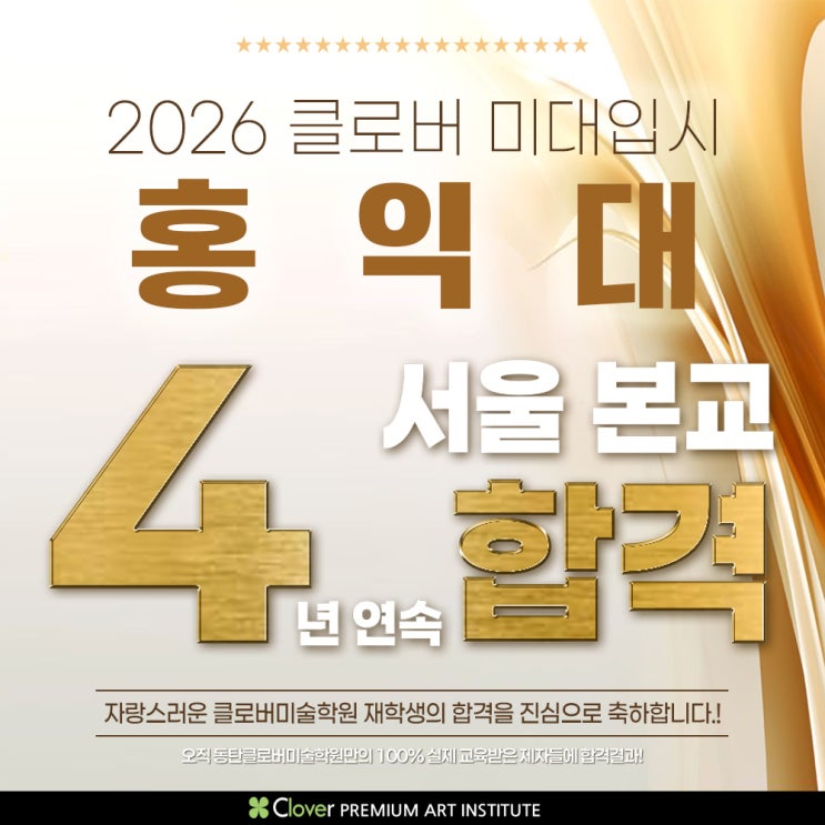 안녕하세요. 항상 기분 좋은 합격 소식을 전달드리는 동탄미술학원 클로버 입시정보팀입니다. 드디어 동탄미술학원 클로버에서 2026학년도 홍익대 합격 소식을 전달드리게 되었습니다. 올해로 4연속 서울 본교에 있는 홍익대 미대입시를 합격하게 된 건데요. 명실공히 자타가 공인하는 전국 최고의 미대입시 명문이라 할만하네요. 특히 올해에는 클로버와 인연이 깊은 학생이 합격한 사례가 많아서 초등, 중학, 고등, 입시까지 연계가 잘 되어있는 클로버 만의 합격 비법을 여러분께 소개 드리겠습니다. 먼저! 2026학년도 홍익대 미대 입시 합격을 위해 최선을 다한 우리 학생과, 동분서주 최고의 교육으로 우리 아이를 지도한 선생님! 그리고 묵....... <img src="https://blogthumb.pstatic.net/MjAyNjAyMDRfMTMy/MDAxNzcwMTgwNTAxOTkx.q2FBXqbncQq3kCSIgLJqMkoyO2u3H3UVqkPXyoHVE_kg.f4Mqkn4V3o4r9AZhtya4qP5a55-TTgYUj9oKQM_Tdigg.JPEG/1.jpg?type=s3" />