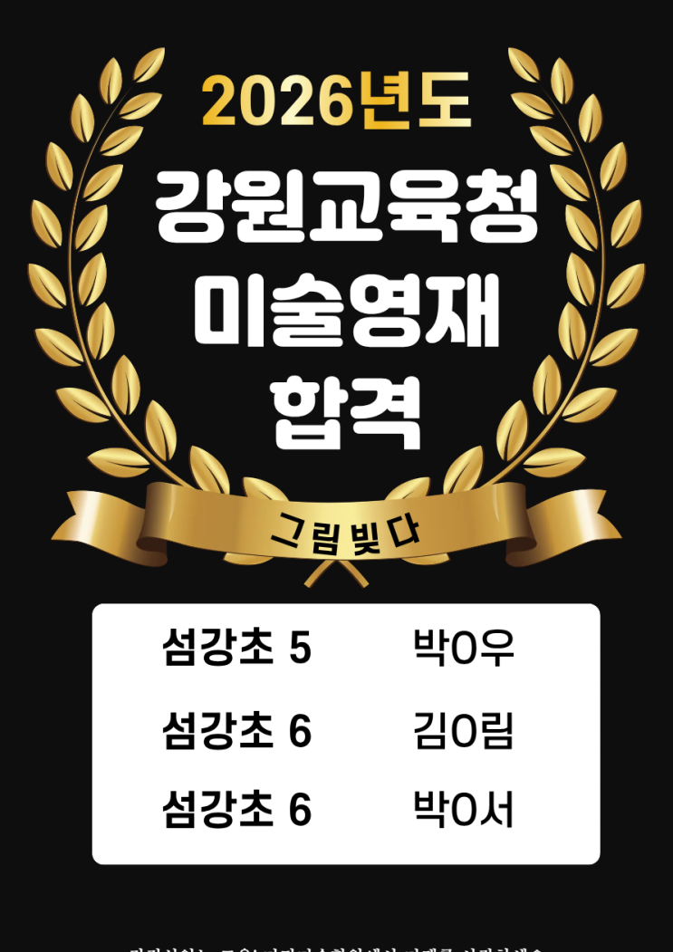 2026학년도 강원교육청 미술영재교육원 합격 소식을 전합니다. 그림빚다에서 준비해 온 학생들이 좋은 결과를 만들어냈습니다. 강원교육청 미술영재교육원 수업은 강원예술고등학교에서 진행되며, 선발 과정 역시 그림실력뿐 아니라 ● 주제 이해력 ● 관찰력과 사고력 ● 자신만의 표현 방식 을 종합적으로 평가하는 전형입니다. 아이들은 정답을 맞히는 그림이 아니라 왜 그렇게 생각했는지, 어떻게 표현할 것인지를 고민하는 연습을 꾸준히 해왔고 그 과정이 이번 합격으로 이어졌습니다. 그림빚다는 관찰 → 사고 → 표현으로 이어지는 미술적 사고력을 중요하게 지도합니다. ■아이의 시선을 존중하는 개별 피드백 ■영재원·예고 진학을 고....... <img src="https://blogthumb.pstatic.net/MjAyNTEyMThfNDYg/MDAxNzY2MDM1NjY5NzQ0.uD1YcZlvUN71ammVV2D3ioiV7BdRBHatH6VOWh09XF0g.Mm2sTb3gWIeQ0NkNEpYYbQDqpyzBfaliIe2skHccN6kg.PNG/%C1%A6%B8%F1%C0%BB_%C0%D4%B7%C2%C7%D8%C1%D6%BC%BC%BF%E4..png?type=s3" />