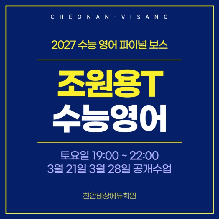 수능 영어 조원용T 공개 수업 안내 자신이 없다면 공개하지 않습니다. 말뿐인 1등급전략은 끝! 수능 영어의 본질을 꿰뚫는 단 한번의 기회! 수강 등록 전 강사의 논리와 실전풀이법을 직접 확인하세요 1차: 3월 21일 (토) 19:00 ~22:00 2차: 3월 28일 (토) 19:00 ~ 22:00 신청서 작성하기⬇ (학원 대표번호로 신청하셔도 좋습니다) 주어진 시간에 해결한다 선택지를 확실히 선별한다 수능 영어 끝판왕, 조원용 영어T 주말 수업이 개설되었습니다. 극강의 수능 지문에 효율적으로 접근하는 방법을 알려주면서, 더불어 빠른 시간 내에 문제를 풀 수 있는 특별한 비법을 안내하는 강좌입니다. 특히 아래와 같은 고민을 가진 고3이라면 지금 즉시 조....... <img src="https://blogthumb.pstatic.net/MjAyNjAzMDlfMTQy/MDAxNzczMDM5NjU3NDg1.3p0OSb7lL5P5s20GYbezf2mk6wWeYRj5QfsR8W8zvnAg.7IIuzaUeJtvDiT39UWRkHHtuWLzeCa_bfPYn089PGWwg.JPEG/%C3%B5%BE%C8%BF%B5%BE%EE%C7%D0%BF%F8%C1%B6%BF%F8%BF%EB%BC%F6%B4%C9%BF%B5%BE%EE%BD%E6%B3%D7%C0%CF20260309.jpg?type=s3" />