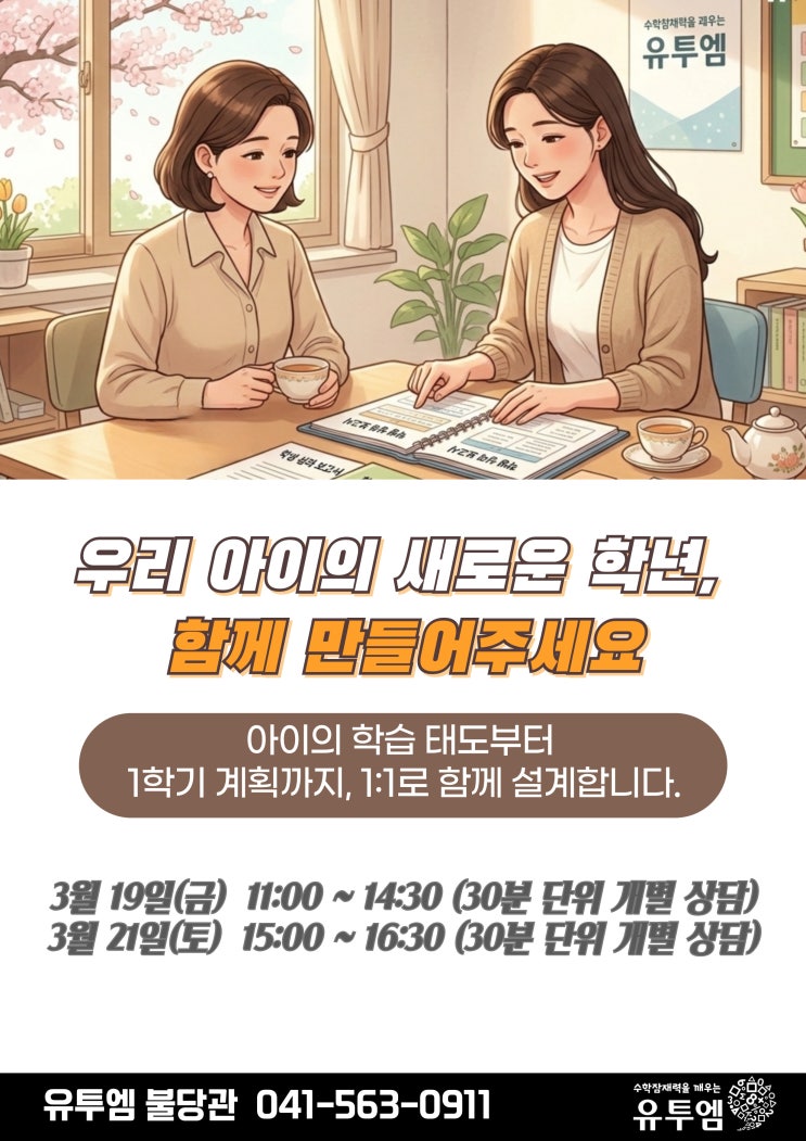 우리 아이의 새로운 학년, 함께 설계합니다 새 학년이 시작되는 시기에는 단순히 학습량을 늘리는 것보다 방향을 잡는 것이 더 중요합니다. 어떤 학생은 공부 방법을 몰라 힘들어하고, 어떤 학생은 목표는 있지만 실행이 어려워합니다. 그래서 유투엠 불당관에서는 학생의 학습 상태부터 목표 설정, 실행 전략까지 함께 설계하는 1:1 학습 간담회를 준비했습니다. ✔ 학생의 현재 학습 상태 진단 ✔ 공부 습관 및 학습 태도 점검 ✔ 새 학년 학습 목표 설정 ✔ 목표를 실현하기 위한 실행 계획 설계 아이들이 새로운 학년에 자신감 있게 적응하고 성장할 수 있도록 실질적인 방향을 함께 만들어 보겠습니다. 일정 안내 3월 19일(금) 11:00 ~ 14:3....... <img src="https://blogthumb.pstatic.net/MjAyNjAzMDlfMjY1/MDAxNzczMDM4NjQ5MDI3.eWSYIeT7erVz_h6taTisZeDS60VMr8UpXyi29cSn-O0g.Xcv2jNduTf-ELo4bUAKXAWDbqwmAhh7TDNn4GLfkpigg.JPEG/%C1%A6%B8%F1%C0%BB-%C0%D4%B7%C2%C7%D8%C1%D6%BC%BC%BF%E4_-002_%2824%29.jpg?type=s3" />