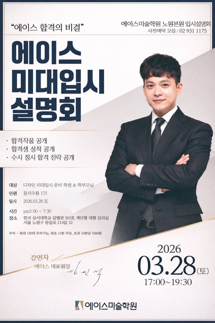 에이스 디자인미대입시 설명회 안녕하세요 디자인미대입시전문 에이스미술학원입니다. 2026년 3월28일 토요일, 성공적인 2027, 2028학년도 입시를 위한 디자인미대입시 설명회가 열립니다. 이번 설명회에서는 -합격 작품 소개 -합격생 성적 공개 -수시 정시 합격 전략 공개 -2028 학점은행제 대비 를 중점내용으로 다루며, 합격생들의 다양한 케이스를 설명하며 우리아이에게 맞는, 입시 방향성을 구축하고 설계할 수 있는 기본 베이스 가 되는 정보가 될 수 있도록 정리했습니다. 학생, 학부모 여러분들께서는 3월 28일 토요일 꼭 방문하시어 설명회에서 제공되는 2027년 최신 업데이트 디자인미대입시 자료와 현장에서 쌓인 경험들과 정보를 얻....... <img src="https://blogthumb.pstatic.net/MjAyNjAzMTJfMTc1/MDAxNzczMzEwMzkzOTE3.NlJ8SUnmLTbn56PwSrwO4d9DIwOZrEuktWCaz3IYKhUg.VFfUzpLuZGrGQ7spWduvkLKF61dLxXckba9NkvmHQqkg.JPEG/2026_%C0%D4%BD%C3%BC%B3%B8%ED%C8%B8_%C6%F7%BD%BA%C5%CD2.jpg?type=s3" />