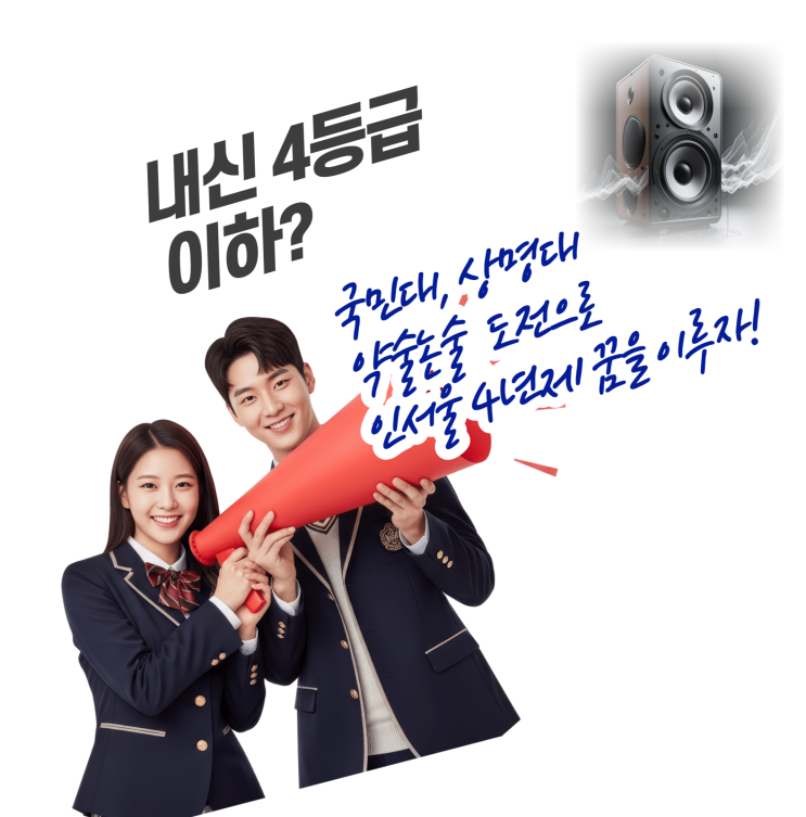 국민대·상명대 약술형 논술 연착륙! 내신 4~7등급 '인서울 턱걸이'가 아닌 '인서울 연착륙' 가능! 내신 1~3등급도 아니고, 내신 4~7등급이 서울 소재 4년제 대학 진입? 멀고 먼 딴세계 이야기가 아닙니다. 학부모님들과 상담을 하다 보면 가장 많이 듣는 자조 섞인 푸념이 있습니다. "우리 아이 내신이 4등급대 이하인데... 서울에 있는 대학은 언감생심이겠죠? 수도권이나 지거국이라도 가면 다행일 텐데요.ㅜ" 불과 2~3년 전까지만 해도 이 말씀에 대부분은 동의하고공감했습니다. 하지만 2025학년도 입시판부터 그 판도가 완전히 뒤집혔습니다. 이른바 '중위권의 동아줄'이라 불리던 약술형 논술 전....... <img src="https://blogthumb.pstatic.net/MjAyNjAzMTJfODIg/MDAxNzczMzEzNzk1NzEy.RPDI8s9I2niF8rH_OleDpfHfT2Lwsiq4aNFjLvXoSeog.pyp8Ig1uVO1DYuvCGLaJGgV7jSn-tZjxfkyB7r3CjIYg.PNG/image.png?type=s3" />