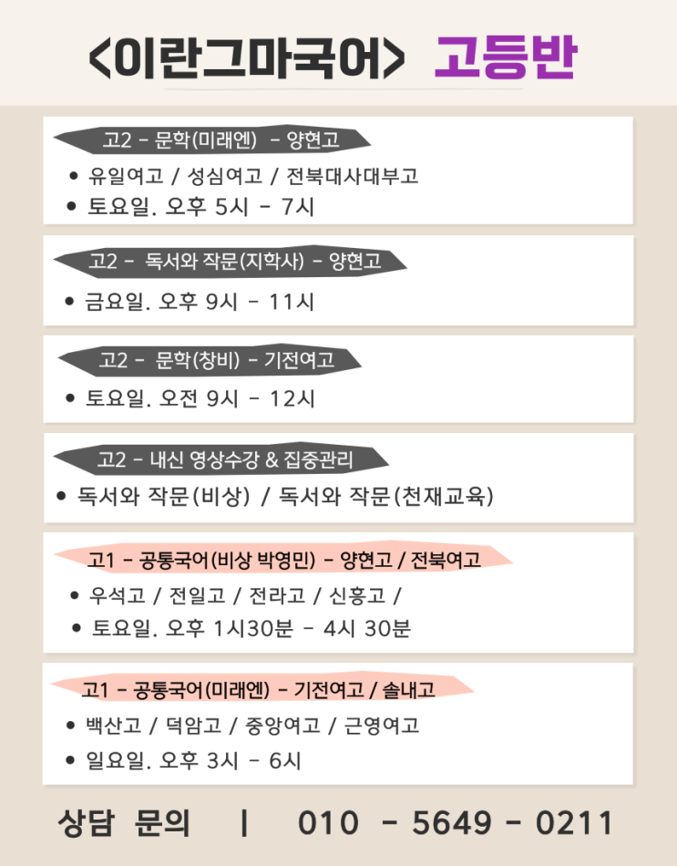 안녕하세요. 이란그마국어입니다. 고1 공통국어 고2 문학 / 독서와 작문을 3월에 개강합니다. 2022 개정교육과정이 적용되는 새 교과서 내용을 자세하고 꼼꼼하게 진행하는 반입니다. 고교학점제에 따라 현 고1, 고2의 경우 1등급이 10%입니다. 때문에 변별력을 위해 수능의 중요성이 더 강조되는 상황이기 때문에 수능 공부에 소홀해서는 안됩니다. 내신 대비 및 수능 전 영역을 체계적으로 가르치겠습니다. 감사합니다. *수업 중인 경우가 많습니다. 문자 주시면 연락드리겠습니다. <img src="https://blogthumb.pstatic.net/MjAyNjAyMThfNDkg/MDAxNzcxNDExNzc3Mzg5.rZ22ZDWH5E1rHmdJu_Si1WYpiWotysIxL8o6Njcv2lkg.152Me38NoTBp4Iwfn_gwOpiUG3VDgDgXD9x-1NrgxRwg.PNG/001.png?type=s3" />