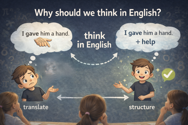 영어를 공부할 때 “직역하지 말고 한국어 처럼 이해해라”라는 말을 많이 듣습니다. 하지만 실제로 영어 실력이 탄탄한 학생들은 영어를 직역하며 영어 자체로 이해합니다. Ⅰ. 직역이 문제인 게 아닙니다 문제는 직역 그 자체가 아니라, 직역한 뒤 다시 한국어로 해석하려는 습관입니다. 예를 들어 문장을 볼 때, I gave him a hand. 를 ❌ “나는 그에게 손을 주었다” → 다시 의미 추측이 아니라, ⭕ give + 사람 + a hand → “도와주다”라는 영어 구조 자체로 받아들이는 것이 중요합니다. 이건 직역을 포기한 게 아니라, 직역을 영어 안에서 끝내는 훈련입니다. Ⅱ. 영어를 잘하는 아이들의 읽는 방식 영어를 잘하는 아이들은 문장....... <img src="https://blogthumb.pstatic.net/MjAyNjAxMTVfMTY3/MDAxNzY4NDM4MDAyOTc4.HxbZQN3_a8LqiWoTIT5F8fJM8p_F1S106KmRBo_yFJog.o3tkhhKAmnvJFF3tooTN7pPGFlaCUUbDNSZzyjiEc7gg.PNG/ChatGPT_Image_2026%B3%E2_1%BF%F9_15%C0%CF_%BF%C0%C0%FC_09_37_51.png?type=s3" />
