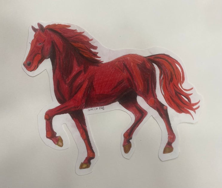 이 작품은 초등학교 2학년 여학생이 색연필로 완성한 ‘적마(赤馬)’ 표현 작품입니다. 종이 위에 등장한 붉은 말은 가볍게 앞다리를 들고 천천히 걸어 나오듯, 하지만 그 몸 안에는 분명한 힘과 자신감이 담겨 있습니다. 2학년 아이의 그림이라고 믿기 어려울 만큼 말의 전체 비율과 움직임의 흐름이 안정적으로 표현되어 있습니다. 이번 수업에서는 ✔ 동물의 기본 형태 이해 ✔ 다리의 방향과 균형 ✔ 색연필을 여러 번 덧칠해 색을 깊게 만드는 방법 ✔ 갈기와 꼬리의 흐름 표현 에 집중했습니다. 이 적마는 단순히 빨간색 하나로 칠한 말이 아닙니다. 붉은색 안에 와인빛, 주홍빛, 어두운 갈색이 자연스럽게 섞이며 몸통과 다리의 입체감을....... <img src="https://blogthumb.pstatic.net/MjAyNjAxMjBfMjAg/MDAxNzY4ODkzNTYyNjgz.AQ3-ebsNhPLxgnNlbX-zIe2bah1tmbyK32TdOeNE9csg.lwIDSuYSZvbkoEl0UL_xAayrcopUAJkF47Scy8wOmagg.JPEG/%C0%FB%B8%B6.jpg?type=s3" />