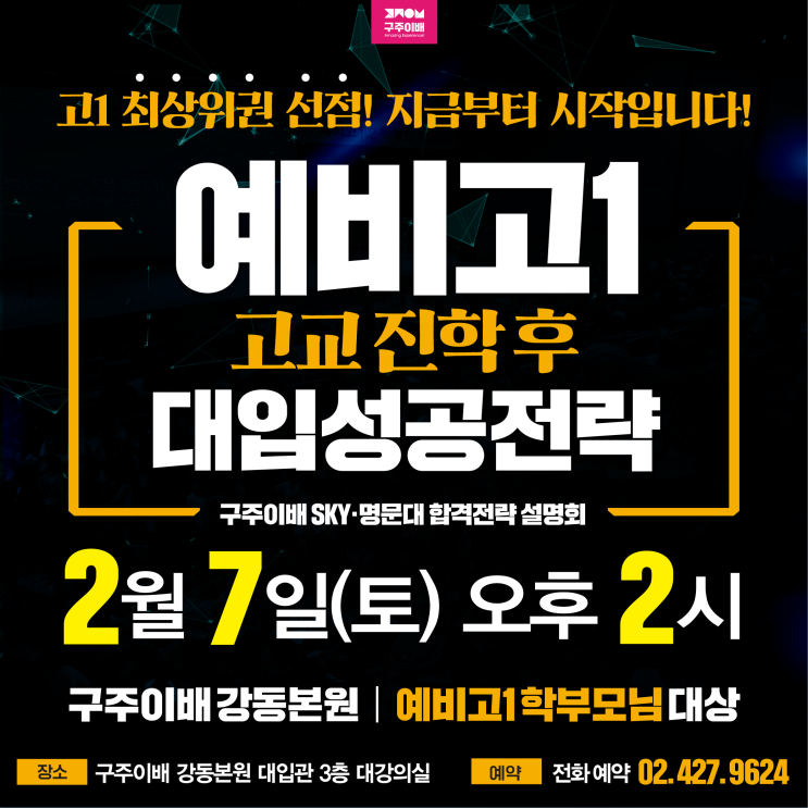 고1 최상위권 선점! 지금부터 시작입니다. "예비고1 고교진학 후 대입성공전략" 구주이배 SKY·명문대 합격전략 설명회 ·일시: 2026년 2월 7일(토) 오후 2시 ·장소: 구주이배 강동대입관 3층 대강의실 ·주제 01. 예비고1 대학입시 주요 특징 및 고교별 대입전략 02. 명문대 진학을 위한 최상위 예비고1 수학학습 전략 03. 지역 고교 특징 분석 및 중간고사 1등급 대비 전략 1월말 발표되는 학교배정에 맞추어 학교별 분석 자료집을 제공예정입니다. 꼭 참석하셔서 정보받아가시길 바랍니다. 예약은 고등부로 02)427-9624 감사합니다. <img src="https://blogthumb.pstatic.net/MjAyNjAxMjNfOTMg/MDAxNzY5MTQ5MTkxNTc4.3a1oSTOK6O7uefpo0AN2axlv9wwKsE9Zx4KwImYicHMg.kxcIMAmIuo1bgynNktZaqqlPA03aQvRu0UGXCgb_Fhwg.PNG/%BF%B9%BA%F1%B0%ED1%BC%B3%B8%ED%C8%B8mms260207.png?type=s3" />