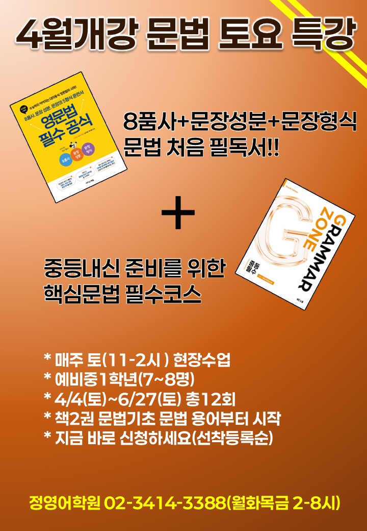 [정영어학원] 4월개강 문법 토요특강