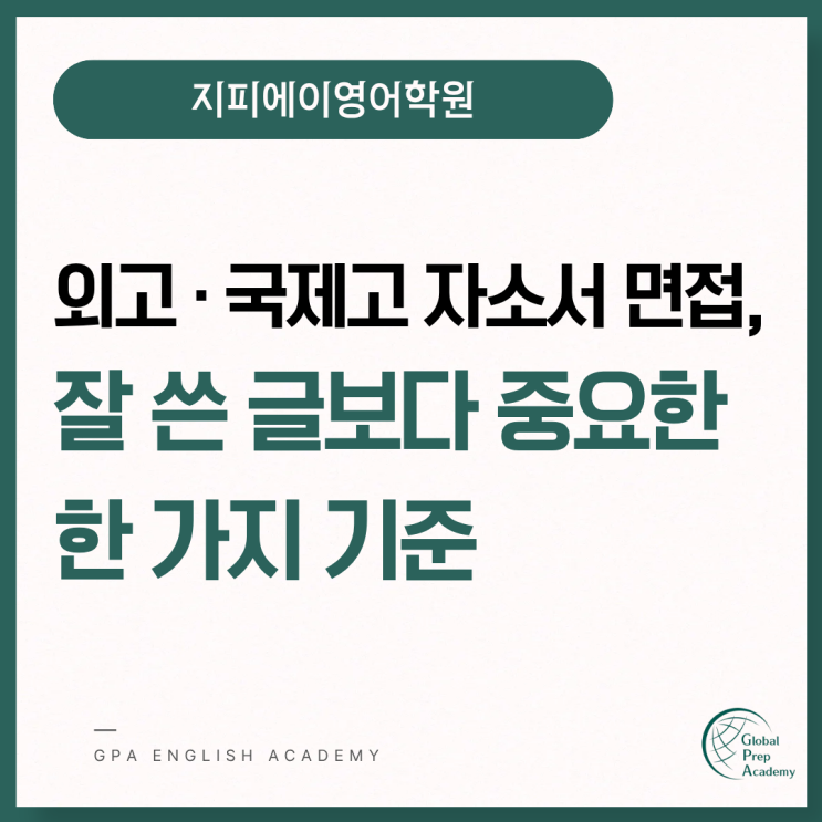 외고 국제고 자소서 면접이 궁금하시다면 안녕하세요. 도곡동 지피에이영어학원 원장 정승주입니다. 11년 동안 국내외 입시를 지도하며 수많은 학부모님들과 상담을 진행해 왔는데요. 외고 국제고 입학을 준비하는 경우에 공통적으로 받는 질문이 있어요. 바로 자소서와 면접입니다. 면접은 어떤 식으로 준비해야 할까요? 소극적인 아이라서 말을 제대로 못하고 올까 봐 걱정돼요. 그래서 오늘은 외고 국제고 자소서와 면접에 대한 제 생각을 말씀드리려고 해요. 목차 1. 자기소개서 가장 많이 오해하는 부분 자기소개서를 작성하면서 학생들이 가장 크게 오해하는 부분이 무엇일까요? 화려한 글쓰기가 좋다고 생각해서 학생이 했던 모든 활동을....... <img src="https://blogthumb.pstatic.net/MjAyNjAxMjVfMjQy/MDAxNzY5Mjk3OTY3OTUx.3CM7hQ2rIzUIleAZTn6FGnfqKkex61udIwzXdcJsINIg.tkwjHviUIZLpKJArvpwY36LhRZtQzGfJAk6vsGXzYwUg.PNG/1.png?type=s3" />