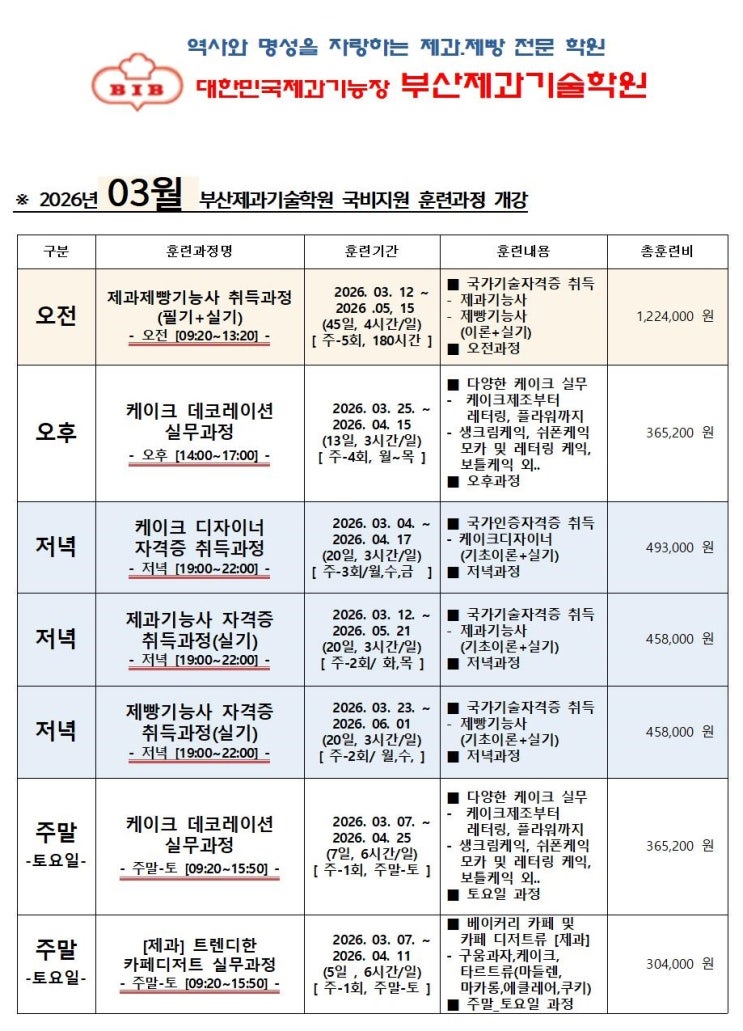 좋은 하루입니다. 부산제과기술학원 [ 부산제과제빵기술학원 ] 입니다. 2026년의 입춘도 지나 갔네요. 올 한해 모두 모두 꽃길만 가득하길... 빛나는 하루, 하루 .. 맛있는 하루가 되시길 부산제과기술학원 [ 부산제과제빵기술학원 ] 교강사 모두 마음모아 여러분들 위해 기원합니다. 더불어,, 2026년 3월 국비지원 국민내일배움카드 훈련과정 개강 안내입니다. 많은 관심과 응원 바랍니다. 저희 부산제과기술학원의 훈련과정 총 훈련비는 재료비를 포함한 모든 훈련비입니다. 상세과정소개 및 신청은 – 고용24 – 직업 능력 개발 – 개인 로그인 https://www.work24.go.kr/cm/main.do 검색창에 통합검색 또는 직업훈련검색을 체크하시고 검색창....... <img src="https://blogthumb.pstatic.net/MjAyNjAyMDZfMzcg/MDAxNzcwMzYyMTY4ODIx.nUrnZNGqPw44_mUVa2G6cKYsVP2aSQTjkelgknYs0y0g.8nbHGV-0tHWj8zCBib037qrgVCQXflvl85XvCqgokzAg.JPEG/26%B1%B9%BA%F1%C8%C6%B7%C3%B0%FA%C1%A4%BE%C8%B3%BB2603001.jpg?type=s3" />