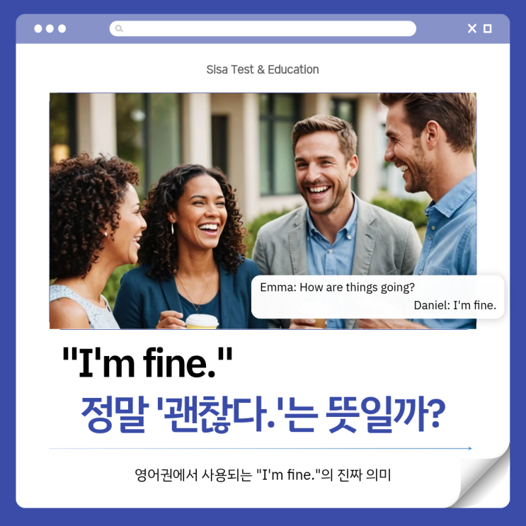 안녕하세요 :) 여러분, 혹시 오늘 아침 부산에 내린 첫 눈을 보셨나요? 눈이 잘 내리지 않는 지역이라 그런지 잠시 흩날리는 눈발에도 가슴이 두근두근 설렙니다!!! 그럼 이 분위기를 이어 오늘의 이야기를 시작해 보겠습니다~ 여러분, 영어로 대화를 하다보면 가장 자주 듣게 되는 말 중 하나가 바로 “I’m fine.” 입니다. 우리에게 너~무나 익숙한 표현이라 자연스럽게 '아, 괜찮다는 뜻이구나.' 받아들이는데요~ 그.런.데. 정말 그럴까요? 영어권에서 "I’m fine."은 항상 ‘괜찮다’는 의미로 쓰이지 않습니다. 때로는 감정을 숨기기 위한 말이기도 하고, 때로는 대화를 더 깊게 이어가지 않겠다는 신호이기도 합니다....... <img src="https://blogthumb.pstatic.net/MjAyNjAyMDdfODgg/MDAxNzcwNDM2MzIwMTg2.b_bogZDM6vmJ-xsMo0QXaSMG3_yZhJPHPngh-h2ZeuIg.0OTYZieZeApZeS2UGJOj9f4ZlwQC1ONQskVJqUJLhtog.PNG/1.png?type=s3" />