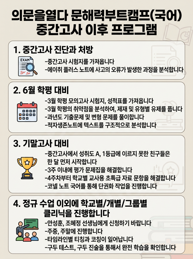 중간고사 끝났다고 쉬면 안 되는 이유 — 의문을열다 문해력부트캠프 중간고사 이후 프로그램 완전 공개 중간고사가 끝난 순간, 두 부류의 학생으로 나뉩니다. "이제 쉬어야지"라고 생각하는 학생과, "지금부터가 진짜 시작이다"라고 생각하는 학생. 성적의 차이는 시험 당일이 아니라, 시험 직후 2~3주에 만들어진다는 사실, 알고 계셨나요? 의문을열다 문해력부트캠프(국어)에서는 중간고사 직후부터 기말고사·학력평가까지를 체계적으로 연결하는 4단계 개인 코칭 프로그램을 운영합니다. 오늘은 그 구체적인 내용을 상세히 공개합니다. 1️⃣ 중간고사 진단과 처방 — 틀린 문제가 아닌, '틀린 이유'를 잡는다....... <img src="https://blogthumb.pstatic.net/MjAyNjA0MjdfMjIg/MDAxNzc3MjcyNzM5NTU4.COyAmfxllqoBNNfC8AH7SWEq4fL-jWtigTTxOLEI4jMg.Nm039W0Nf7vo5yKDwzJt2LAkqd1RviynZBFoaBMiMs0g.PNG/KakaoTalk_20260427_153406334.png?type=s3" />