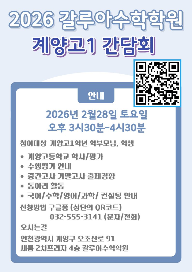 안녕하세요, 갈루아수학학원입니다 2026학년도 계양고 1학년 신입생을 앞둔 학부모님과 학생을 모시고 입학 전 준비 전략을 안내해 드리는 간담회를 진행합니다. 고등학교 첫 시작은 방향 설정이 가장 중요합니다. 학교 학사 일정부터 수행평가, 시험 출제 경향까지 한 번에 정리해 드립니다. 간담회 일정 일시 : 2026년 2월 28일(토) 오후 3시 30분 ~ 4시 30분 대상 : 계양고 1학년 신입생 학부모님 & 학생 장소 : 인천광역시 계양구 오조산로 91 새롬 2차프라자 4층 갈루아수학학원 주요 안내 내용 ✔ 계양고등학교 학사 일정 및 평가 방식 ✔ 수행평가 준비 전략 ✔ 중간·기말고사 출제 경향 분석 ✔ 동아리 및 학교 활동....... <img src="https://blogthumb.pstatic.net/MjAyNjAyMTdfOTgg/MDAxNzcxMjY1ODQzOTIx.I8xddUjASf990NsipE33lol9toYGAAJbACiClDT5KVwg.HBZDk8vO98XxF_8SW48xQzpciG72kACOLq5iek5YLNMg.PNG/image.png?type=s3" />
