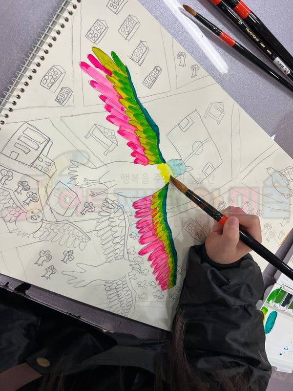 학생들 모두가 지난주 개학 이후 새학기에 적응하느라 몸과 마음이 바쁜 시기를 지나고 있습니다. 두번쨰 주에 접어든 지금은 다들 어느정도는 학교 생활이 익숙해진듯도 싶구요. 시작된 새학기 모두들 즐겁고 유익한 배움의 시간이 되었으면 좋겠네요^^ 유치반 초등반에서 원근법의 개념 이해를 위한 수업을 했습니다. 조금 더 쉽고 재미있는 이해를 위해 '하늘위에서 바라본 풍경'을 주제로 한 수업입니다. 먼저 하늘을 나는 새를 중심으로 스케치를 하고 있습니다. 펼친 날개와 세세한 깃털까지 스케치만 봐도 멋지네요. 원근감을 위해 뒤에 보이는 새는 작게 그려줘야 하겠죠? 하늘위에서 바라보니 학교도 보이고 우리 아파트도 동....... <img src="https://blogthumb.pstatic.net/MjAyNjAyMjNfMjIg/MDAxNzcxODQxMDkzMjQw._hk77bTyYz3G648JJqVtfs60UWBcHfkU5eF-T5PkB-Ig.6B7clBkkDHN4W_1ae5ft375wlNxWDd_NP7luse-vzq0g.JPEG/IMG_6355.jpg?type=s3" />