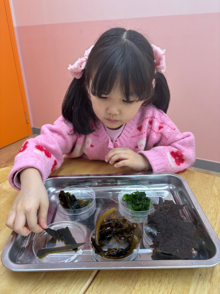 귀염둥이 6세 이번주 과학수업은 파래, 다시마, 김을 직접 만져 보고, 색깔을 구분하면서 각각의 특징을 찾아보았어요. ▶바닷말 분류 그림판에 바닷말 카드를 분류해 보며 바닷말은 사는 곳에 따라 색깔이 다름을 확인했어요. ▶관찰한 파래, 다시마, 김도 분류하기 위해 따뜻한 물에 넣어 보았어요. 이 과정에서 파래에서는 초록색 물, 다시마에서는 갈색 물, 김에서는 빨간색 물이 나오는 것을 확인할 수 있었어요. ▶김을 직접 만들어 보았어요. 실제로 먹는 김과 바닷속에 사는 물김의 생김새가 다름을 알게되었어요. ♥가정연계활동♥ 엄마와 함께 미역국을 만들어 보며 미역을 관찰해 보는 시간을 가져 보세요. 갈조류인 미역은 갈색을 띠....... <img src="https://blogthumb.pstatic.net/MjAyNjAyMTFfMTIy/MDAxNzcwODAwNDUxOTQ3.YbppbksecKCy38iewgeCM15fa6U1lDV6PBRe4PxXtdwg.0bKpHKEc27xwnBjulzsGJZjCiUe1BvInE2dagEh7Bbkg.JPEG/1770799168684.jpg?type=s3" />