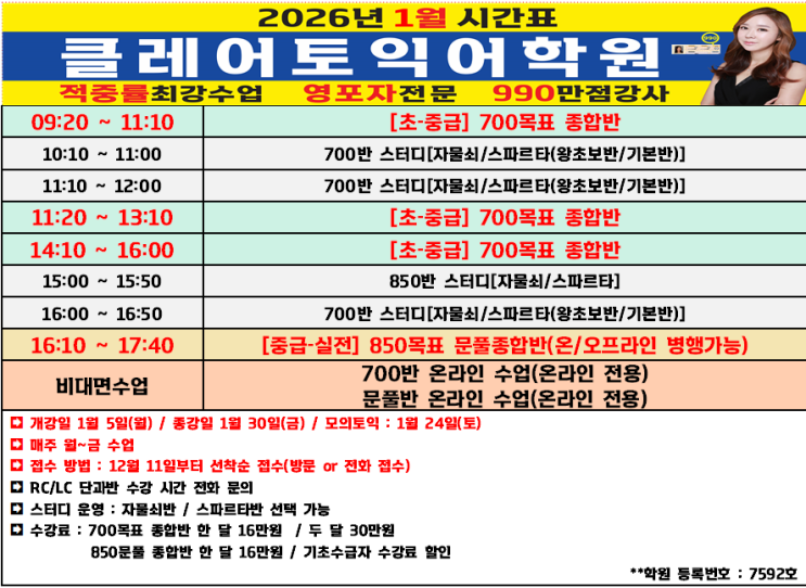 클레어토익 26년 1월 시간표 ✔️700반 타 시간 교차수강 가능해요. (필요시 요청) ✔️700반 개인 사정으로 결석일때는 온라인 수강 가능하니 수업 사수 해 주세요. ✔️문풀반 온라인/오프라인 자유롭게 수강 가능해요. ✔️스터디 전담 짱쌤이 가르쳐주는 무료 과외 스터디 (안 하면 손해!!) ✔️자물쇠반 : 단어시험+ 과제검사 ✔️스파르타반 : 단어시험 + 과제검사 + 짱쌤그룹수업 (왕초보반/기본반 선택) ✔️ 학원에서 자율학습 할 수 있어요 :) ✔️수강문의 010 2846 2401 <img src="https://blogthumb.pstatic.net/MjAyNTEyMTJfMTc1/MDAxNzY1NTAzMTE5ODA0._vYXzBKED5VEuqvYX4J0GCoVMRVpHr6yMSqPOnfMfB4g.cd5DJb-GeePGUO5EnpMLV7COCvEQe7m6VgC5vBdLNzUg.PNG/26%B3%E2_1%BF%F9.png?type=s3" />