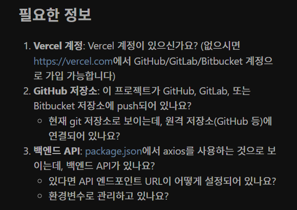 1. 배포를 위한 준비 위처럼 프롬프트를 작성하고 배포(deploy)를 진행 해보자. 나에게 요청한 정보들을 준비하자. 2. github 저장소에 업로드 a. git init : 현재 작업 중인 디렉토리(폴더)를 Git 버전 관리 시스템을 사용할 수 있는 새로운 Git 저장소(repository)로 만들어주는(초기화하는) 명령어 터미널에서 명령어를 입력한다. b. commit & publish github desktop 프로그램을 활용하자. https://desktop.github.com/download/ > github desktop 프로그램을 다운받고, 설치한다. > 현재 내가 작성하고 있는 프로젝트의 폴더를 불러온다. > 커밋을 위해 메시지를 입력한 뒤, 파란색 버튼을 누른다. > 첫 publish 를 하고 있....... <img src="https://blogthumb.pstatic.net/MjAyNTEyMTZfMTUx/MDAxNzY1ODY1NTgzMDI5.vKRBTyaBTaPNGtP2twAj4jp5q-aKxJ8iyRl1_QaDDiAg.U6Q-40pj5RQ3HXISBLA298jMVQc_h-1yS6DuWurgtM4g.PNG/image.png?type=s3" />