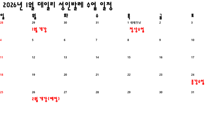 안녕하세요! 전주성인발레 전문 데일리발레스튜디오 2026년 1월 수업 등록 및 일정 안내드립니다. 25년 시작을 알리는 공지를 작성한 기억이 얼마 전 일처럼 느껴지는데, 맙소사! 벌써 연말이라니... 정말 시간이 화살처럼 지나가네요^^; 먼저, 26년1월 수업일정은 첨부드린 달력 참고해 주세요. 특이 사항은 2월 연휴 일정으로 인해 개강날짜를 앞으로 당기게 되었습니다. 12월29일(월) 첫 수업 시작하여 4주간 수업 진행됩니다. 새해첫날 1월1일(목)에 정상수업 진행 되니 착오없도록 스케쥴 체크 부탁드립니다. 등록 안내드립니다. 기존회원 재등록은 12월23일(화)까지 입니다. 꼭 기한내 재등록 해주시고, 이후부터 신규등록 시작되며 정원 마....... <img src="https://blogthumb.pstatic.net/MjAyNTEyMTZfNzIg/MDAxNzY1ODQ3NjU1MjEx.qf_JFcSWw5rhBcdLi3PERjwaI1-aOIz6c4O4doXOOk0g.C23LoWbRPn9PIV-MuQWesgx5CAbOe6RxRHxnna7VRT8g.GIF/1%BF%F9.gif?type=s3" />