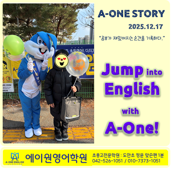 오늘은 에이원의 도안초 두 번째 홍보 날이었습니다. 토끼 친구와 알록달록한 풍선, 그리고 마리오와 함께하는 인형 뽑기 시간으로 아이들을 만나는 현장을 열었습니다. “Line up!” 선생님의 한마디에 도안초 친구들은 위험하지 않게, 자기 차례를 기다리며 차분하게 한 줄로 서 주었습니다. 이 작은 장면 하나만으로도 아이들이 얼마나 잘 배우고, 또 얼마나 잘 반응하는지 느낄 수 있었던 순간이었습니다. 학원 이름을 기억해 달라며 조심스럽게 부탁했더니, 고맙게도 아이들은 매번 큰 소리로 “에이원!” 하고 따라 말해 줍니다. 그리고 한 친구는 선물을 받아 들고는 Thumb up! 환한 얼굴로 이렇게 외쳐 주고 가더군요. “A-One is the be....... <img src="https://blogthumb.pstatic.net/MjAyNTEyMThfMTU5/MDAxNzY2MDAyNzM4MTMx.2jxN6GNZfIKmQvebXazrCM9PrPE-bdk4VEwbIYgOfCkg.FkguBSMSkPdEQ5p2--cg_7e8aB0wlzwq602dw0vxrc4g.PNG/image.png?type=s3" />