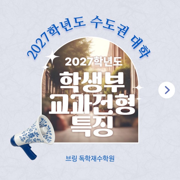 2027학년도 수도권 대학 학생부 교과전형의 특징을 알아 봅시다! 1) 모집 규모가 여전히 크고 중요도가 높음 ✔ 수도권 주요 대학은 2027학년도 대입에서 학생부교과전형으로 약 8,400명 안팎을 선발하며, 수시에서 내신 중심 전형 비중이 높은 편입니다. 교과전형은 전통적으로 내신 중심 선발이라는 특성을 갖고 있습니다. 2) 학생부 교과 성적 반영 방식 다양화 단순 평균 등급이 아니라 대학별로 반영 과목 환산 점수 방식 특정 과목 가중 등 반영 방식이 다양해졌습니다. 같은 교과 성적이라도 대학마다 유·불리가 달라질 수 있습니다. 3) 수능 최저학력기준 변화 많은 대학들이 교과전형에서도 수능 최저기준을 적용하지만 전반적으로 수능....... <img src="https://blogthumb.pstatic.net/MjAyNjAyMTBfMjE3/MDAxNzcwNzAxMzMwMzQ5.Qvg2w6UvGN1htdtLI6syBU9VQlJOfJi_kfjH_VCXOXkg.ENFGC-d_HtHC89hcssMGDYEazd9clBWdRzjpFryzAbUg.JPEG/%C1%A6%B8%F1%C0%BB_%C0%D4%B7%C2%C7%D8%C1%D6%BC%BC%BF%E4._%289%29.jpg?type=s3" />