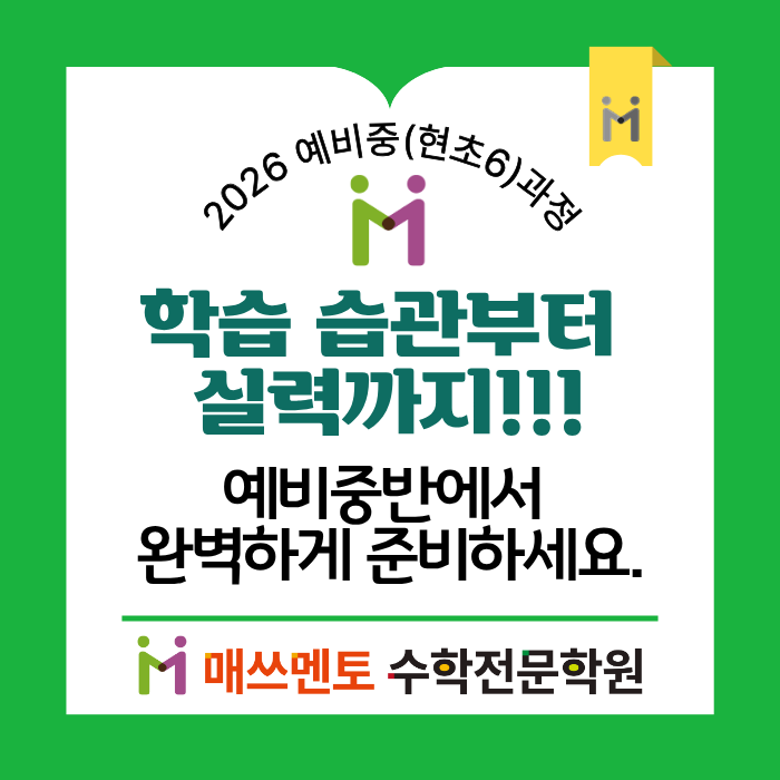 정원 : 5명 주 3회 : 1시간 30분씩 <중학교 진학, 왜 준비가 필요할까요?> 초등학교와 중학교의 가장 큰 차이는 학습 난이도와 과목 수의 증가입니다. 초등학교에서는 비교적 여유롭게 공부할 수 있었다면, 중학교에 들어서면서부터는 주요 과목의 깊이가 달라지고 시험과 평가가 본격적으로 시작됩니다. 많은 학생들이 이 변화에 적응하지 못해 첫 학기부터 어려움을 겪곤 합니다. 그렇기 때문에 중학교 진학 준비는 선택이 아닌 필수입니다. <매쓰멘토수학전문학원의 예비중반 프로그램의 특징> 저희 학원의 예비중반은 단순한 선행학습이 아닙니다. 학생 개개인의 수준을 고려한 맞춤형 수업시스템을 통해 실력 향상과 학습 습관....... <img src="https://blogthumb.pstatic.net/MjAyNjAyMjBfMjY5/MDAxNzcxNTY3MDg0MDY4.34xEnwyiWnBDKegw_a9E26_1DOJXpOFULoypdM5DT98g.WiC3WvudPIySAESfNqJGCqETzRgsDzqVV_O_XVk4JOYg.PNG/%C1%A6%B8%F1%C0%BB_%C0%D4%B7%C2%C7%D8%C1%D6%BC%BC%BF%E4._%2854%29.png?type=s3" />