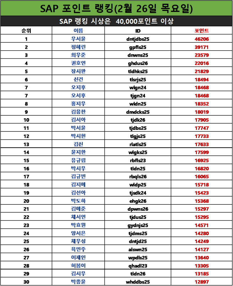 안녕하세요, 더클래스어학원입니다. 2025년 02월 26일 기준 SAP 포인트 랭킹 순위표입니다. <img src="https://blogthumb.pstatic.net/MjAyNjAyMjZfMjYg/MDAxNzcyMDg1NzI3MzU2.94338DrdnEAhGeJRL_86hEt5YiykgY3XRwEdIV13JGsg.CPRnnAW4puVMYU9swXTJSgmzr4epC5Rl5sDstNcRSvgg.PNG/image.png?type=s3" />