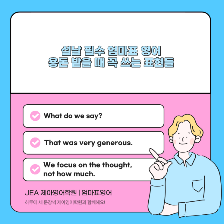 안녕하세요! 대전 관저동 1:1 프리미엄 맞춤 영어학원 JEA 제아영어학원입니다. 설날이 되면 아이 손을 잡고 어른들 앞에 서게 되는 순간들이 많아지는데요! 인사를 해야 하고, 선물을 받고, 고마운 마음을 표현해야 하는 시간 설날처럼 주고받는 마음이 오가는 날에는 영어 단어보다 한 문장이 전하는 태도가 더 중요해져요. 오늘은 설날에 우리 아이에게 꼭 들려주고 싶은 엄마표 영어 문장 세 가지를 소개해 드려요! 뻔하지 않지만 자주 쓰는 영어 3문장 이번 주 7일 동안 3번 사용해 보기 도전해 보시는 건 어떨까요? 일주일에 3문장씩 한 달에 4주가 있다면 무려 12문장을 한 달에 배울 수 있답니다. 1년이면 144문장을 사용하실 수 있답니....... <img src="https://blogthumb.pstatic.net/MjAyNjAxMjlfMTMx/MDAxNzY5NjYyNTIxNDI2.rRJT64ZDU_U_UPcEO7shoD-K3z3AhcaeqEESAdnKfmMg.LA9mXDJAO2Q0Ddn4ClKA4vxdo_STnNwrebIOOZ3be8Ag.PNG/%C1%A6%B8%F1%C0%BB_%C0%D4%B7%C2%C7%D8%C1%D6%BC%BC%BF%E4._%2813%29.png?type=s3" />