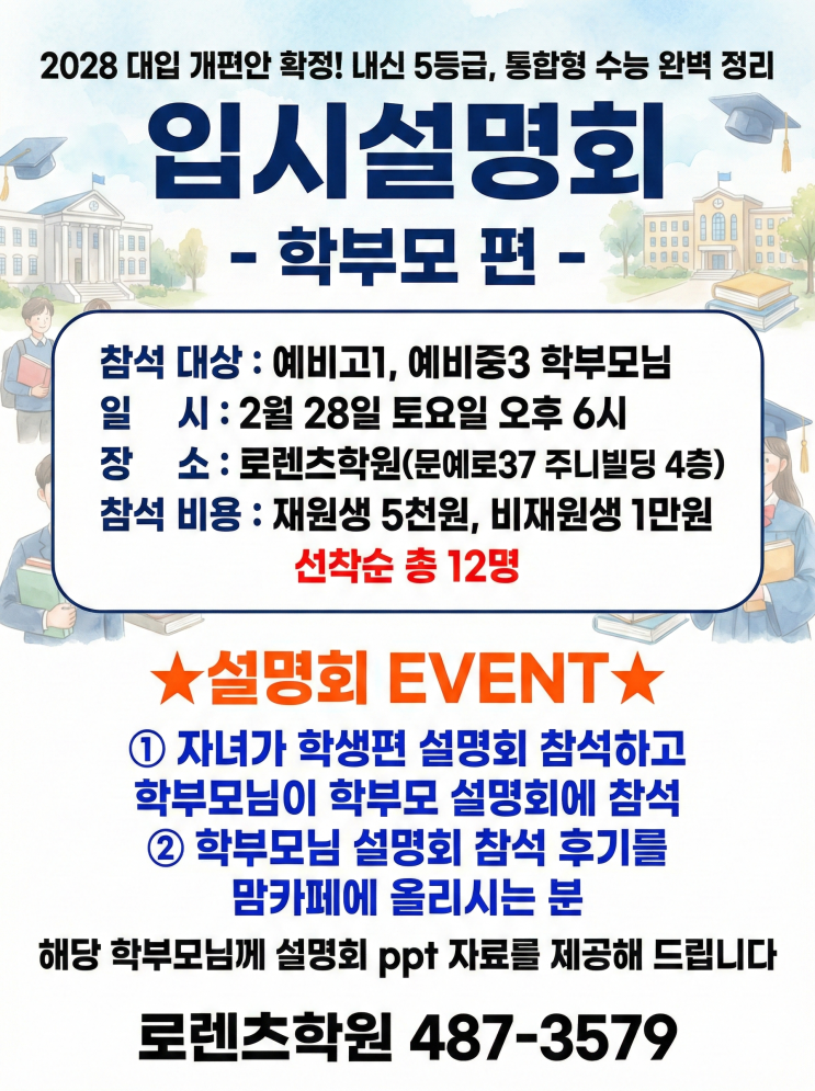 학부모님 대상 입시설명회 개최 안내 아이들이 먼저 듣고 놀라워했던 그 내용! 이번에는 학부모님을 위해 동일한 내용으로 자리를 마련했습니다 변화하는 입시, 아는 만큼 성공합니다 일시 2월 28일 (토) 오후 6시 장소 로렌츠학원 (대전 서구 문예로 37 주니빌딩 4층) 모집 인원 선착순 12명 마감 ✅ 신청 방법 아래 링크를 클릭하여 신청서를 작성 후 참가비를 계좌로 입금 [ 설명회 신청 바로가기] https://forms.gle/TXKsM65C59YdJfWQ6 특별 이벤트 설명회 자료(PPT) 제공 참석하시는 학부모님 중 아래 조건에 해당하는 분들께는 설명회 내용이 담긴 PPT 자료를 제공해 드립니다 조건 1. 지난번 학생 설명회에....... <img src="https://blogthumb.pstatic.net/MjAyNjAyMTFfMjMz/MDAxNzcwODE4ODY0OTA3.gLTyLyfXqsXlL8x__arXSeUFCGMFiBT8qdfxA_HgNmAg.1E-wetHCgfmF9DHYmPQbtzh0t-gjK3vcrud2OKIq5Ugg.PNG/Gemini_Generated_Image_oe5820oe5820oe58.png?type=s3" />