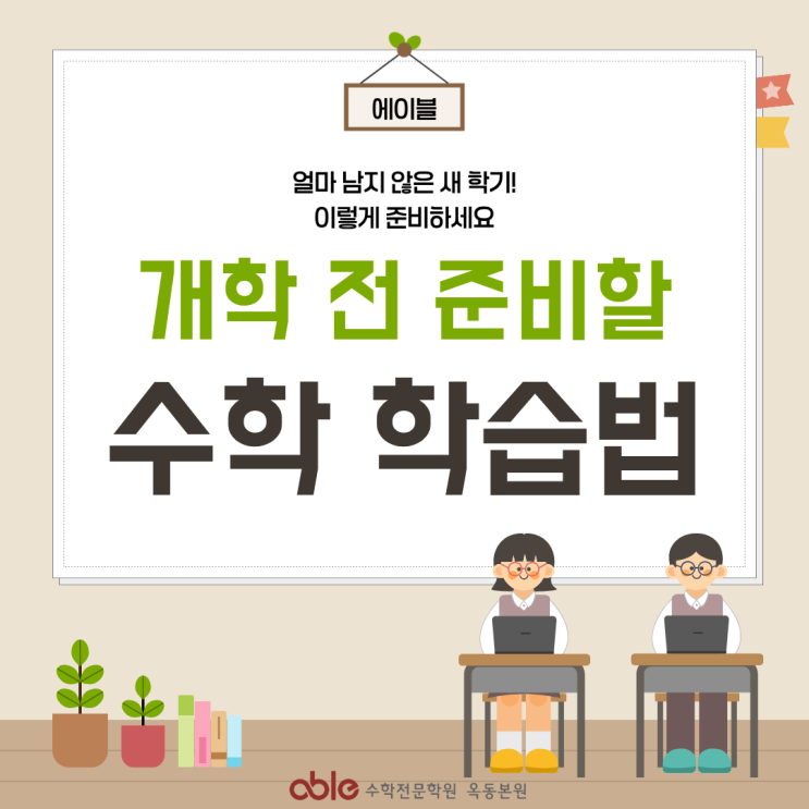 안녕하세요! 에이블 수학학원입니다:) 벌써 새 학기 개학이 얼마 남지 않았는데요! 많은 학생들이 이 시기에 마음이 조급해집니다. “뭔가 더 해야 할 것 같은데…” “선행을 더 나가야 할까?” 하지만 지금은 앞으로 나가기보다 지난 내용을 정리하고, 루틴을 다시 세울 시간입니다. 새 학기를 어떻게 준비하면 좋을지에 대해 준비했습니다! 개학 직전 가장 먼저 해야 할 일은 새 내용을 배우는 것이 아니라 점검입니다. 가장 많이 틀렸던 문제 다시 풀기 풀이 과정을 끝까지 써보기 계산 실수 유형 체크하기 문제를 많이 푸는 것보다 “왜 틀렸는지 아는 것”이 더 중요합니다. 다시 풀어도 막히는 문제가 있다면, 그 부분은 약점이 될 가능성....... <img src="https://blogthumb.pstatic.net/MjAyNjAyMjBfMTg5/MDAxNzcxNTUzMzY2Mzc0.P_ie1uU-0-VFfhp-GxYY3h0W5G0E2HJ1nEffEIBMAPMg.OxI1a3IDgyJDIQmVmo2ETIGWhzVZXRCfJueZMWmtqUgg.PNG/1.png?type=s3" />