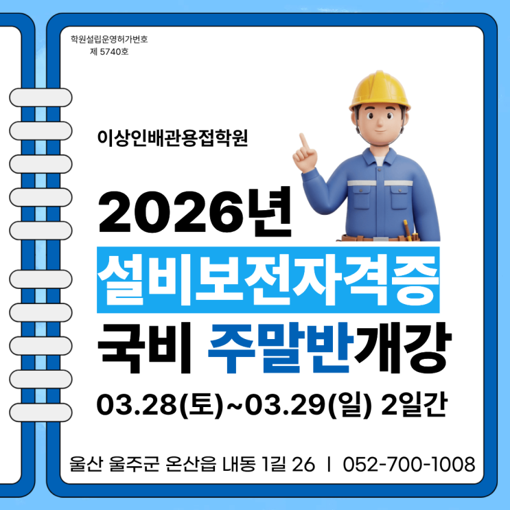 안녕하세요. 울산국비용접학원 이상인배관용접학원입니다. 오늘은 기계설비유지관리자 자격에 관한 내용으로 설비보전자격증 교육내용을 안내드리고자 합니다! 기계설비유지관리자란, 건물이나 시설 안에 있는 기계설비를 안전하고 효율적으로 유지/관리하도록 법으로 지정된 책임자를 뜻하는데요. 자격 기준은 아래와 같습니다. 물론, 설비보전기사 뿐만 아니라 저희 학원에서 교육하는 공조냉동, 에너지관리, 용접, 배관 등 다양한 자격증 취득 후 실무경력이 있다면 기계설비유지관리자의 자격을 취득하실 수 있습니다. 오늘은 3월 28일(토) 개강하는 설비보전 자격증 수업에 대해서 알려드리도록 할게요! 2025년 시험부터 설비보전기사에....... <img src="https://blogthumb.pstatic.net/MjAyNjAyMTNfMTk1/MDAxNzcwOTUzNDgwODA5.a0La9gsG2pTZ92_cdr73E92z8EqS4ufUFNNahhH9iAwg.P8EJCT13uGs3uYBrIN9tNBHUgxolzmlzXPUzDSngZ0Mg.PNG/1.png?type=s3" />