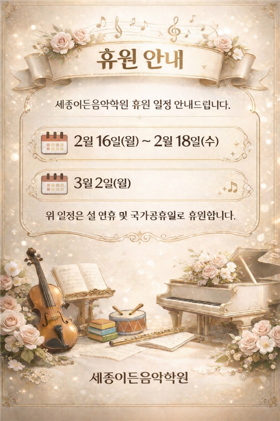 이든음악학원 2월 휴일 안내문 입니다☺️ 이든음악학원을 찾아주시는 모든분들 새해 복 많이 받으시구요ㅎㅎ 즐거운 명절되세요♀️ 세종이든음악학원 커리큘럼 체계적이고 꼼꼼한 1대1레슨 원장 및 강사진 음대 피아노전공 다양한 레파토리 수업 저명한 콩쿨대회 매년 2회이상 참여 네달에 한번 동영상 및 피드백 카톡전송 다양한 무대경험 제공 개인별 각각 다른 커리큘럼 적용수업 #아름초피아노 #나래초피아노 #온빛초피아노 #아름동피아노 #유치원피아노 #아름동유치부 #아름동 #아름동피아노학원추천 #세종시 #세종시피아노 #세종시음악학원 #대전콩쿨 #세종콩쿨 #아름동 #범지기마을피아....... <img src="https://blogthumb.pstatic.net/MjAyNjAyMTdfODIg/MDAxNzcxMzExNDg4Nzk0.0Gr6zcGvyu2tl4hNQuCBTTVJwZI-tWqyGrCL8BwbUuEg.QO9T59upcVjk1TM8pUp7EgJQ8AxC4CqE8rMeMmgthy4g.PNG/1770543603791.png?type=s3" />