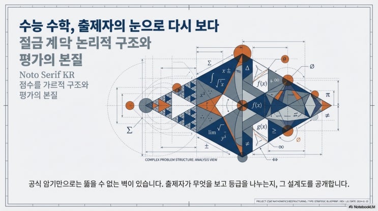 ① 계산 능력 ▸ 출제자는 왜 이걸 보는가 생각을 시작할 최소 조건이 되는지를 보려고 한다. 계산이 안 되면, 사고력은 보여줄 기회조차 없다. ▸ 이 능력이 약한 학생의 특징 공식은 외웠는데 부호 하나로 전부 무너짐 계산하다가 불안해져서 다른 풀이로 도망감 “알았는데 실수했어요”를 매번 말한다 ▸ 수능에서는 이렇게 나온다 문제는 쉬워 보이는데 답이 안 맞는다 마지막 한 줄에서 숫자 정리하다가 틀린다 계산 실수 하나로 추론·문제해결 점수까지 0점 ▸ 그래서 이렇게 연습해야 한다 계산을 ‘속도’가 아니라 ‘확신’으로 연습해라. 하루 10문제라도, 한 줄도 의심 없이 끝내는 연습이 먼저다. ② 이해 능력 ▸ 출제자는 왜 이걸....... <img src="https://blogthumb.pstatic.net/MjAyNjAxMjRfNDAg/MDAxNzY5MjI5OTcxNjUx.qY5WoC_g8o5gddEjJCIZfAZokxKjlfyXv-WP45ulsfwg.Ge5DANkhnOFEeDfWtp5HjyEWPxTbjGrKF9mAE-mrbewg.JPEG/The_Examiner%26rsquo%3Bs_Math_Blueprint_%281%29_1.jpg?type=s3" />