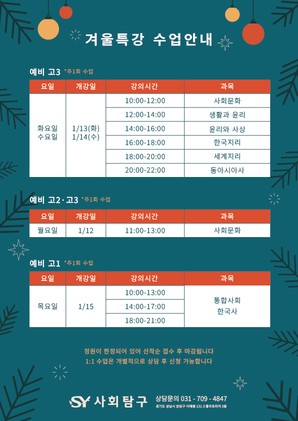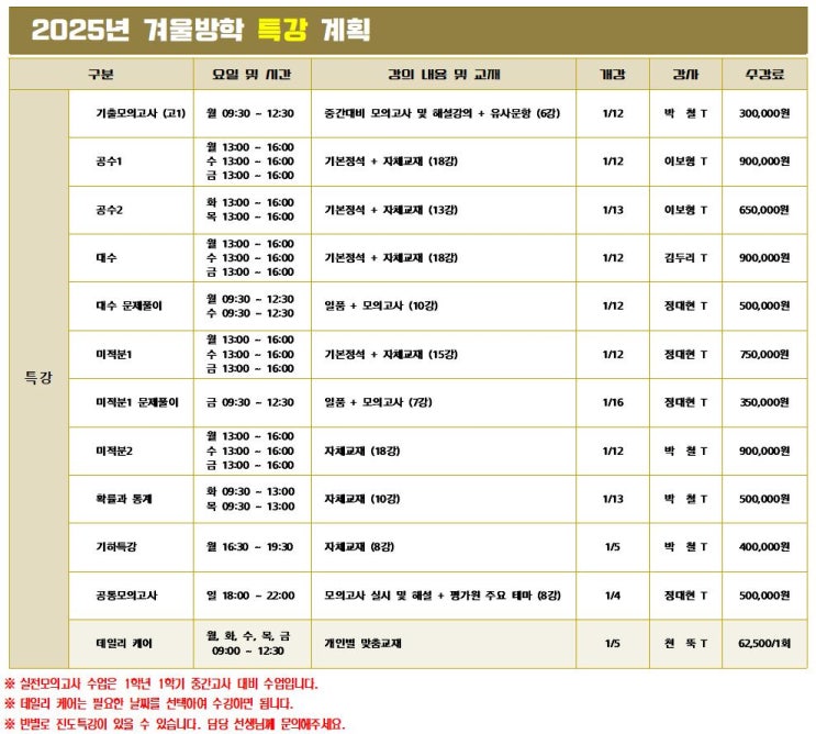 겨울방학 특강 신청 접수 시작합니다. 인원부족시 특강 개설이 취소될수 있음을 양해부탁드립니다. 특강 신청은 아래 링크를 통하여 접수 부탁드립니다. <img src="https://blogthumb.pstatic.net/MjAyNTEyMjdfMjQ5/MDAxNzY2ODA3MjQ5Njkw.Z4r0FAnqsDEewVV1YqsBHVEqQow39X-JULqcoIOL234g.2mRZWDSuco8Dacu5IyfxFnMcFA9Tkb45qTMCz6xidtEg.JPEG/%B0%DC%BF%EF%B9%E6%C7%D0%C6%AF%B0%AD%BD%C3%B0%A3%C7%A5.jpg?type=s3" />