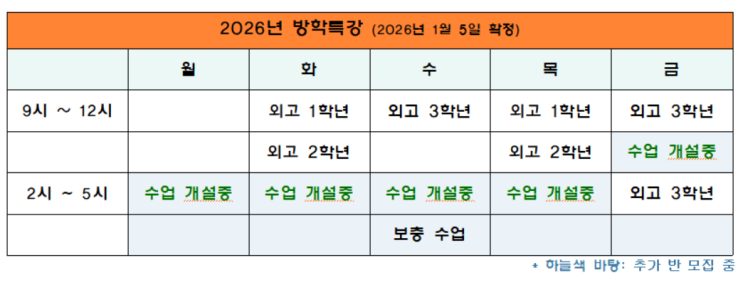 방학은 생각보다 짧습니다. 1학기 범위 예습을 끝내려면 망설이지 말고, 지금 시작하세요. 한 명이라도 서현중국어의 도움이 필요하다면, 최선을 다해 함께하겠습니다. 학원이기 전에, 교육자이길 바라는 마음입니다. ※ 초록색 ‘수업 개설중’ 표시는 추가 반 모집 상담 가능합니다 인원 충원 시 바로 개강됩니다. 안녕하세요. 서현중국어 학원입니다. 2026년 겨울방학 특강 시간표를 안내드립니다. ⏰ 수업 시간 오전반: 9시 ~ 12시 오후반: 2시 ~ 5시 요일별 수업 구성 [화요일 / 목요일] 오전: 외고 1학년 / 외고 2학년 오후: 개설 중 / 보충수업 - 1학년 1월 8일 개강 - 2학년 1월 13일 개강 [수요일] 오전: 외고 3학년 (1반) 오후: 클....... <img src="https://blogthumb.pstatic.net/MjAyNjAxMDVfMjMw/MDAxNzY3NjA2OTg1NTAw.RfJFKiO5UOwRqhkbCZuOvL6GdKDlmBJjjFVVl3N-sHcg.QwTVIw6RyAgb2KzU4om7EofdSUpz8VcYCVUUQJpnbjgg.PNG/image.png?type=s3" />