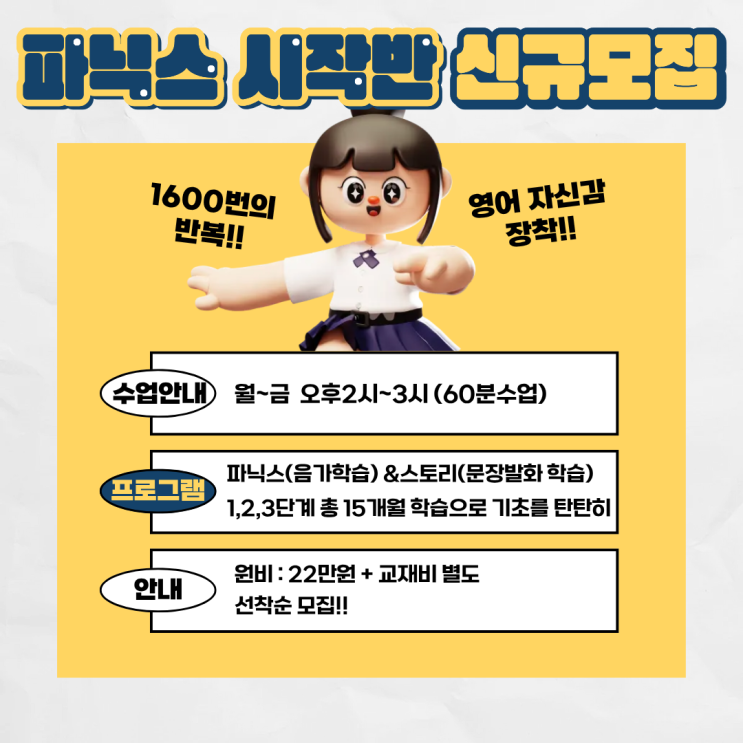 방학은 알차게 잘 보냈나요? 드디어 개학이 코앞이네요~ 개학하는 3월에는 학교에 적응하느라 힘들지만 새로운 마음으로 공부를 시작할 수 있는 시기이기도 합니다~ 영어는 파닉스가 탄탄해야 단어 읽기, 쓰기, 암기까지 가능하다는거 알고 있으시죠? 예일에서는 1600번 이상의 반복으로 모국어처럼 영어를 읽고, 쓰고, 말할 수 있게 됩니다!! <1단계> 알파벳 첫소리를 인식하여 파닉스의 기초를 다집니다. 지시어를 듣고 반응하여 간단한 문장을 만들어 냅니다. 4개 이상의 단어를 사용한 문장 표현이 가능합니다. <2단계> 자음과 모음이 결합되는 파닉스 과정의 기본규칙을 습득합니다. 일상 생활의 표현을 익혀 자연스러운 대화가....... <img src="https://blogthumb.pstatic.net/MjAyNjAyMTNfMTA3/MDAxNzcwOTkzMDIzMTY4.70zE-VbM7qa7ErpHmUTKyG-fcfYcZgEs6LYHjWZjIgwg.ITmXAgxptuUzbscClSN-_i0SeokHpnSB9T1IHGBHoQkg.PNG/%C1%A6%B8%F1%C0%BB_%C0%D4%B7%C2%C7%D8%C1%D6%BC%BC%BF%E4._%289%29.png?type=s3" />