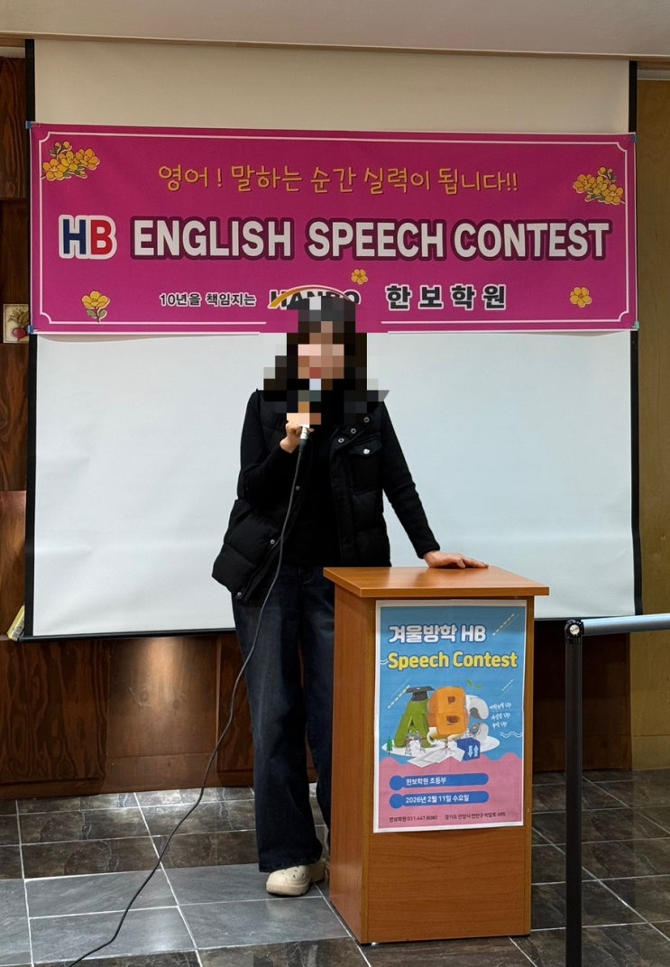 우리 아이들의 도전, 영어 스피치 대회 현장 지난주, 우리 학원에서는 초등부 영어 스피치 대회가 열렸습니다. 이번 대회는 단순히 영어를 잘 말하는 자리가 아니라, 친구들 스스로 대본을 쓰고, 연습하고, 무대에 서는 ‘도전의 과정’이 담긴 시간이었습니다. 대회를 준비하는 동안 아이들은 ✔ 주제에 맞게 생각을 정리하고 ✔ 영어 문장을 하나하나 직접 고치고 ✔ 발음과 제스처까지 신경 쓰며 정말 열심히 연습했어요. 처음에는 “선생님, 이거 너무 어려워요”라고 말하던 친구들도 연습이 쌓일수록 점점 자신감이 생기는 모습이 인상적이었습니다. ⸻ 떨렸지만, 끝까지 해낸 우리 아이들 대회 당일, 무대에 서기 전 긴장....... <img src="https://blogthumb.pstatic.net/MjAyNjAyMTlfMTI3/MDAxNzcxNDk3MjYxOTUz.QVv0QoQLTHhQcJjl32Mc12oU-7QtYdKV3dpB4QdfF3Qg.InBYhKFJqW14deLQqDQXoDAXTBwxLvxqT_BzXfvQxzAg.JPEG/output%A3%DF3773278259.jpg?type=s3" />