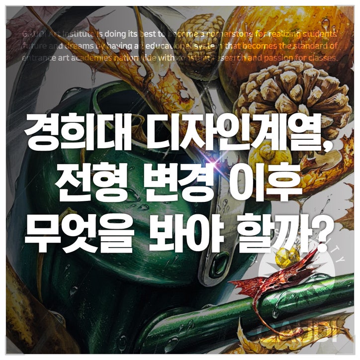 평촌미술학원 가우디 경희대 디자인계열, 소묘 폐지/전형 변경 이후 무엇을 봐야 할까? 경희대학교 디자인계열 실기는 2026학년도 수시부터 소묘가 폐지되고 디자인 단일 전형으로 변경되었습니다. 이 변화는 단순히 시험 과목 하나가 줄어든 것이 아니라, 준비 방향과 실기 전략 전반을 다시 점검해야 하는 중요한 전환점입니다. 이번에 소개하는 선생님 연구작은 경희대 기출 문제 유형을 바탕으로 제작된 작업으로, 물 조리개를 중심 제시물로 하고 낙엽, 솔방울, 가을 열매가 함께 제시된 상황을 디자인적으로 해석한 사례입니다. 경희대 디자인계열은 제시물이 비교적 명확한 편에 속하지만, 그만큼 구성의 완성도와 조형 해석 능력이 직접....... <img src="https://blogthumb.pstatic.net/MjAyNjAxMTJfMTQy/MDAxNzY4MjE5MDcyMzMx.r_I5C7zMrz01cntYok7KjfYDIt9CXVo35mh3fG3X8BEg.N_5xJV4kZlR3EYDvEqU4JR9a3eGbX7JwaROJmT0s8JUg.JPEG/%B0%E6%C8%F1%B4%EB%BF%AC%B1%B8%C0%DB.jpg?type=s3" />