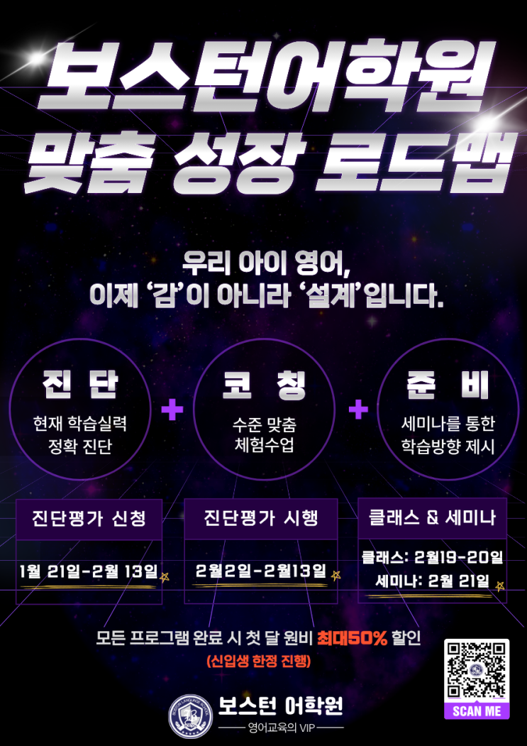 안녕하세요, 초지캠퍼스장 입니다 :-) 다가오는 3월 새학기를 대비, 초지캠퍼스에서 맞춤성장로드맵 프로젝트를 진행합니다. 이 소식을 우리 보스턴학부모님들께 가장 먼저 전해드리려고 합니다. 이번 프로그램은 아직 보스턴어학원을 경험해보지 못한 학생들을 위해 준비한 프로그램인데요! "우리는 이미 보스턴을 다니는데 나랑은 별상관없는거 아니야?" 라고 생각하실 수 있지만, 항상 감사한 우리 기존 보스턴학부모님들을 위한 혜택도 준비되어 있으니 끝까지 봐주세요~ 학습진단 → 체험수업 → 로드맵제시(세미나) 진정한 All in One '소문은 들었는데, 막상 기존의 학원을 옮기려니 좋은 선택인지 확신이 없는데...'....... <img src="https://blogthumb.pstatic.net/MjAyNjAxMjNfODIg/MDAxNzY5MTQ4MjY5NzQ4.ExpzgQf21ZLkeZ5vgqnCIJCWSxUMtkJIHIO7668-Fbsg.p5aOtJE-YJml5mVdlhTjAaUdnndNr2bwG6kBn41cCkMg.PNG/26%B3%E2_2%BF%F9_%BC%BC%B9%CC%B3%AA.png?type=s3" />