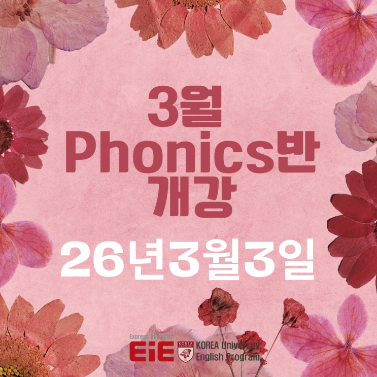 안녕하세요 최상위반 국제학교 커리큘럼과 TOEFL수업, 원서정독수업, Essay강화수업과 중고등내신, 수능완벽대비까지 Phonics부터 수능까지 고려대학교 국제어학원입니다. 최적화된 시간 배분과 풍부한 커리큘럼으로 학생의 가능성을 창조하고 열린 수업을 통한 글로벌 인재의 실력과 자질을 기를 수 있는 최고의 커리큘럼으로 다가가겠습니다. 학부모님들께서 가장 많은 문의를 주셨던 매년 기다리시는 반, 2026년 3월 새학기 Phonics반 과정을 개강합니다. 조기 마감 주의! 다가오는 3월 신학기, 즐거운 영어시작을 위해 PPB 정규반과 PPC 늘봄 특별반 Phonics과정을 새롭게 개강합니다. (PPA반은 현재 1자리 남아 있습니다) <PPB> 정규....... <img src="https://blogthumb.pstatic.net/MjAyNTEyMjZfODEg/MDAxNzY2NzIyMDg2MDA3.hhOa_QoSkgmTZhhq-YrGb2ZBkiM8vHS-xzxKTcY1NiEg.rsmY74voRZOIDkPfV6SnA5CEP58o4GqWCdNwumKFZXgg.PNG/26_3%BF%F9%B0%B3%B0%AD.png?type=s3" />