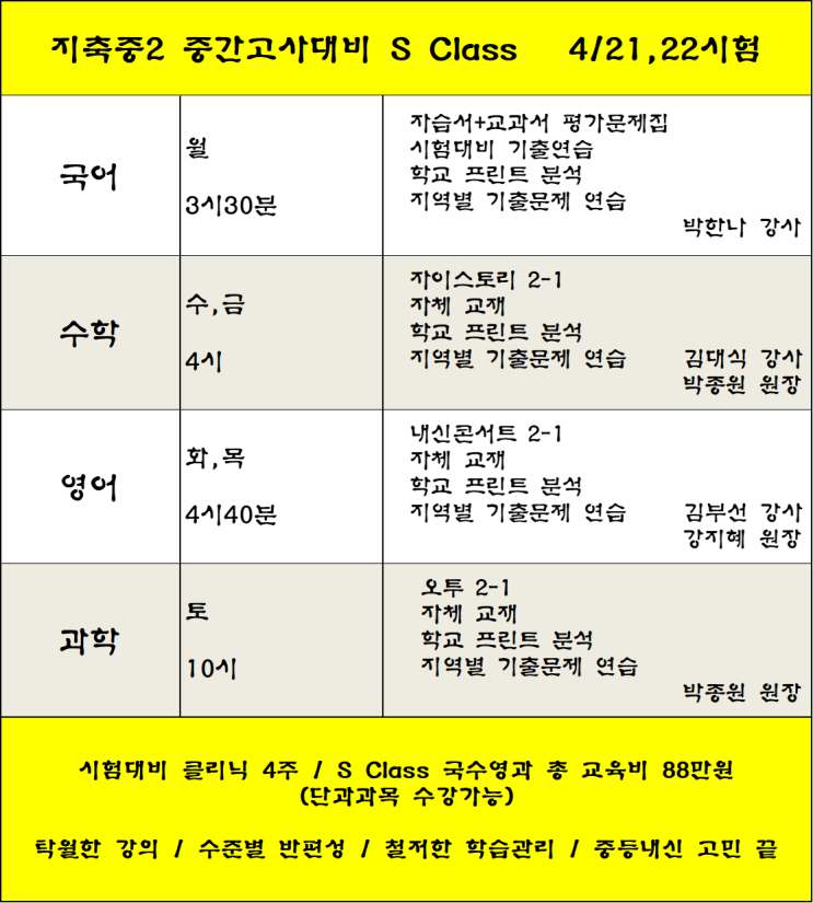 지축중2 만점종합반 학원시간표