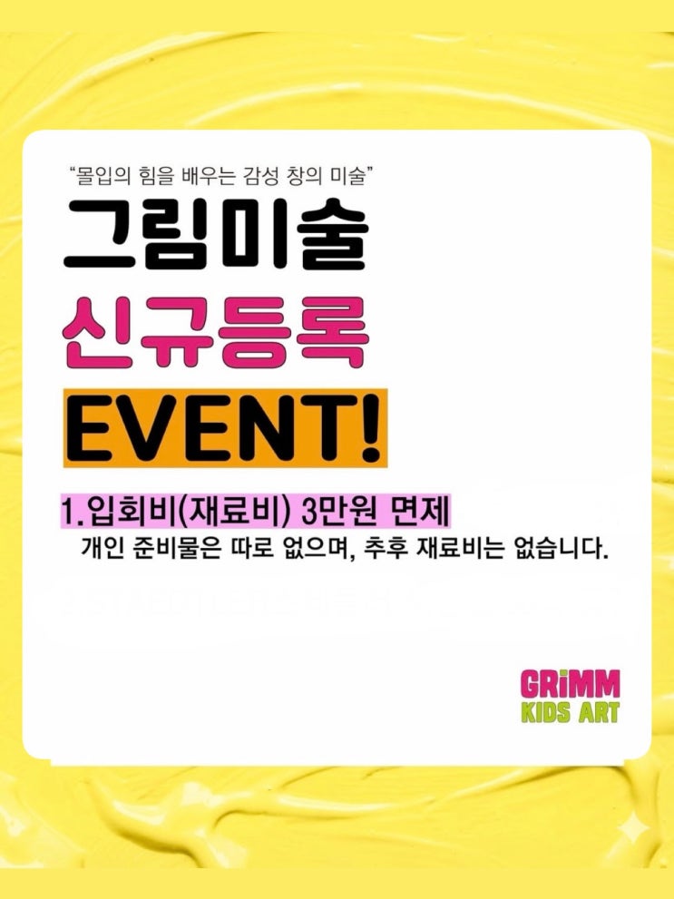 안녕하세요:) 3월부터 그림미술 2026 신학기 신규 등록 이벤트를 진행합니다! 1. 입회비(재료비) 3만원 면제 1. 3월 27일까지 등록 시 입회비(재료비) 3만원 면제 적용됩니다. 개인 준비물은 따로 없으며, 추후 재료비는 따로 없습니다. 시간표 변동은 3월 초에 굉장히 많고, 아이들 방과 후가 정해지고 난 후에 보통 거의 픽스가 되어요. 학원이 강선초 바로 옆에 있다 보니, 아무래도 방과 후 혹은 돌봄 교실 이 후에 많이 보내주셔서 황금 시간대는 마감이 빠른 편입니다. 아니면 같은 상가 피아노가 끝나거나, 태권도 차량 상가 앞에서 하차 후에 오는 친구들도 많아요:) 시간표는 선착순으로 마감되오니, 문의는 3월 초에 편안하게....... <img src="https://blogthumb.pstatic.net/MjAyNjAyMjJfNTQg/MDAxNzcxNzU1ODk2MjM1.C-8eei2RfzI2HnK3yy5vMSZvyzSR5VnvwpzxdDAOv2sg.zluIOy4cJf6UHYtDL-irpBlDpS9uRscvp2EO2KEL4IQg.JPEG/KakaoTalk_Photo_2026-02-22-19-24-30.jpeg?type=s3" />