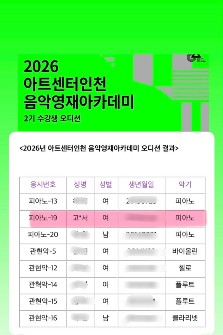 아트센터인천 음악영재아카데미 합격