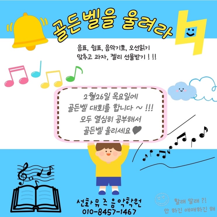 안녕하세요, 선화뮤즈음악학원입니다 이번 2월, 우리 학원에서 특별한 이벤트를 준비했어요! 바로 "골든벨을 울려라!" 대회입니다 어떤 대회인가요? 음표, 쉼표, 음악기호, 오선읽기 등 음악 이론 지식을 겨루는 퀴즈 대회예요. 정답을 맞추면 과자와 젤리 선물도 받을 수 있답니다! 단순한 퀴즈가 아니라, 평소 수업 시간에 꼼꼼히 배워온 음악 기초 지식을 확인하는 소중한 시간이에요. 연습의 결실을 확인하고, 성취감과 자신감을 동시에 키울 수 있는 자리입니다 ✨ 대회 일정 일시: 2026년 2월 26일 (목요일) 장소: 선화뮤즈음악학원 선화뮤즈음악학원은요 선화뮤즈음악학원은 단순한 연주 기....... <img src="https://blogthumb.pstatic.net/MjAyNjAyMjBfNzMg/MDAxNzcxNTQ3OTMzMDQ1.Tr5Zt7oGo1qBrikP3udoBGPnID8z2wYns-RqqPp8IBog.Po5uV5IsiV8vzJakmm4hqg4arHQjWvihHyHlVmfVDy0g.JPEG/IMG_9872.jpeg?type=s3" />